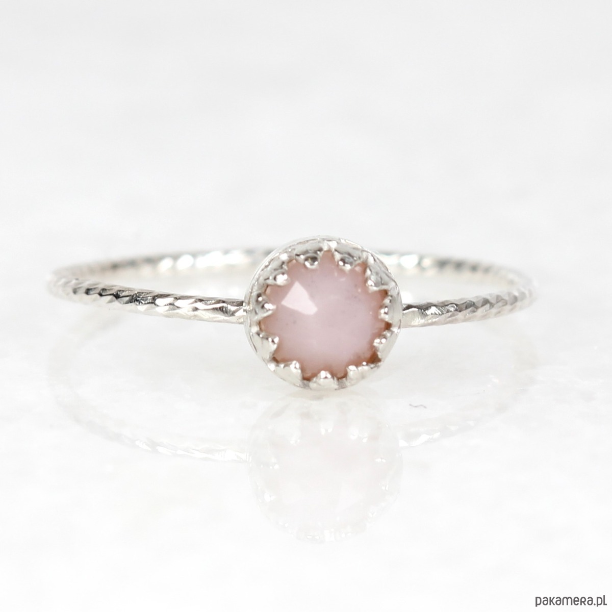 Ręcznie wykonany pierścionek z opalem różowym ze srebra z przepięknie fakturowaną obrączką i ozdobną cargą wokół kamienia w stylu Vintage.