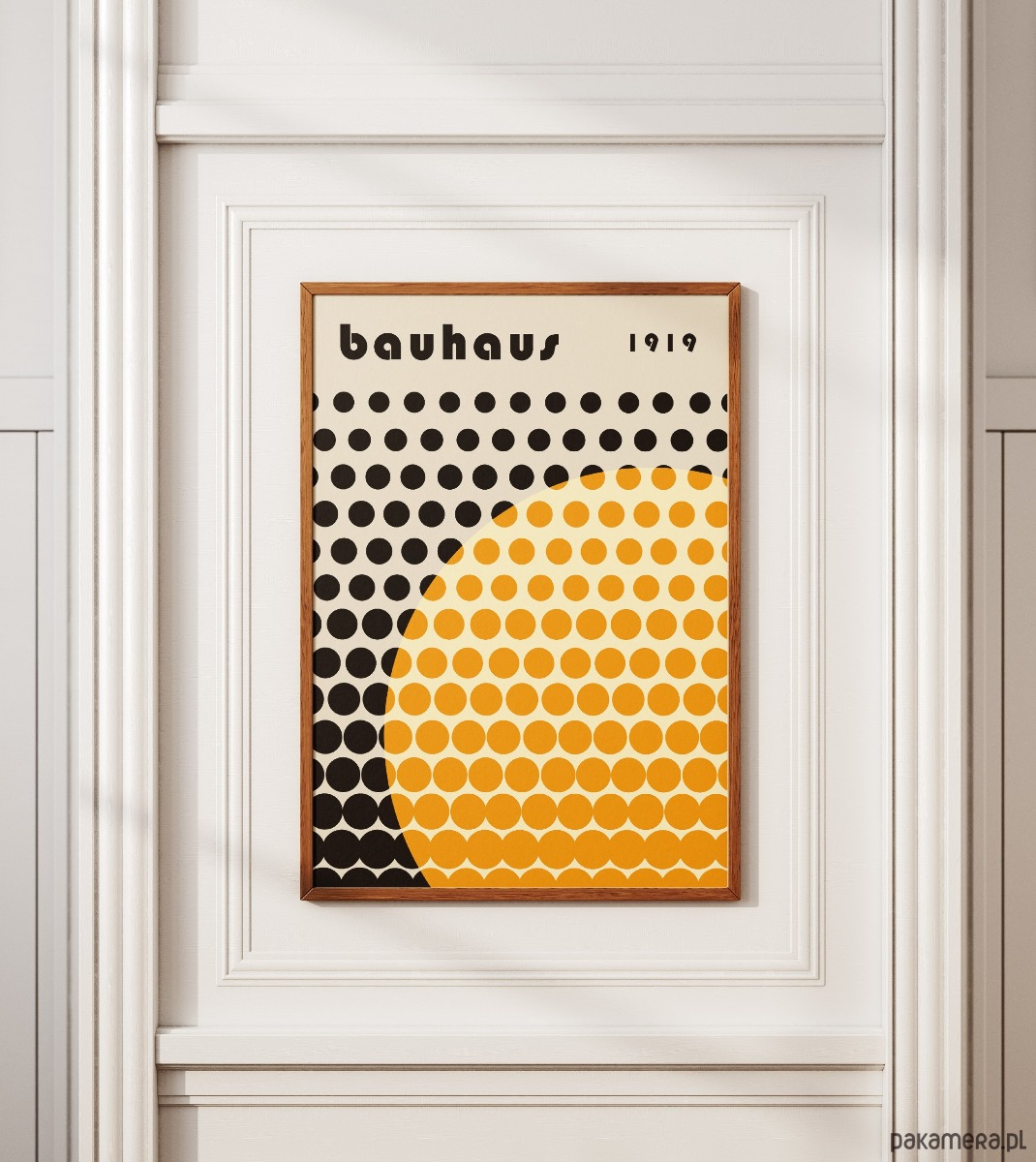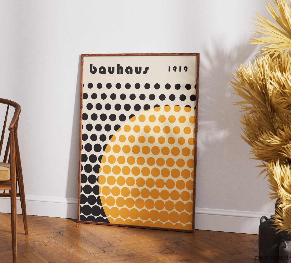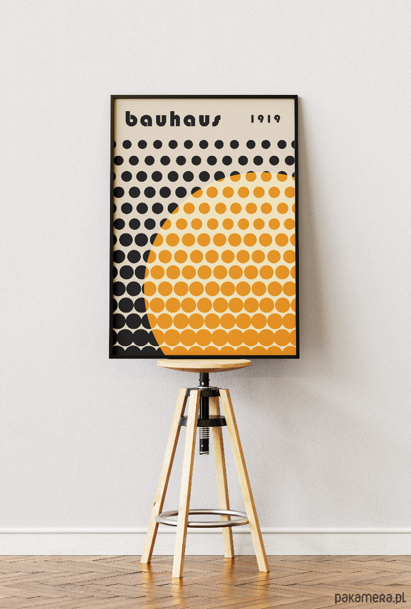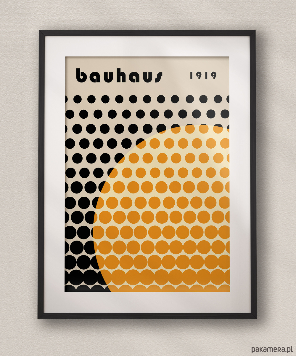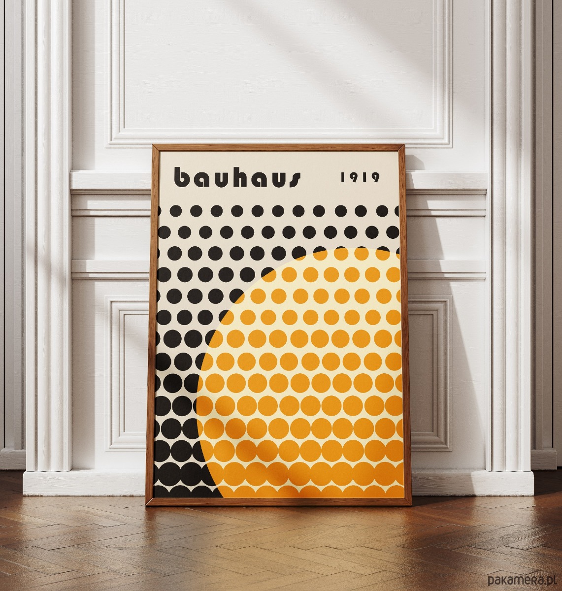 Plakat prezentuje klasyczną estetykę Bauhausu z 1919 roku, skupiając się na rytmie i geometrii. Centralnym punktem kompozycji jest wielkie, słoneczne koło, które kontrastuje z uporządkowanym rastrem czarnych kropek. Minimalistyczna forma oraz charakterystyczna dla epoki typografia tworzą ponadczasowe dzieło, które celebruje harmonię między sztuką a techniką.
