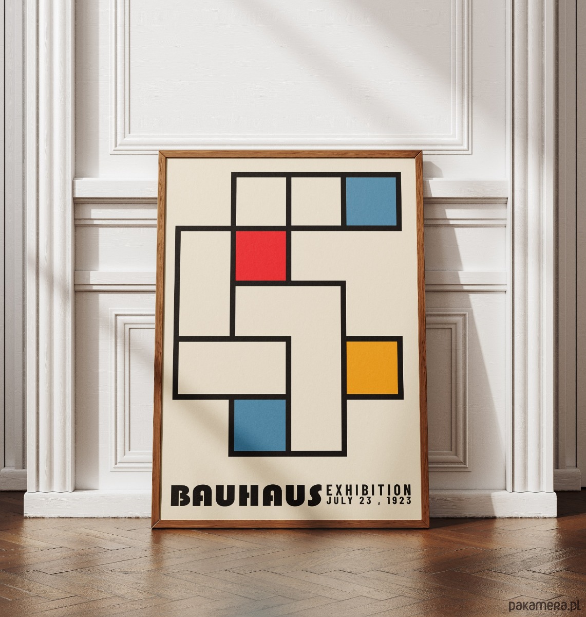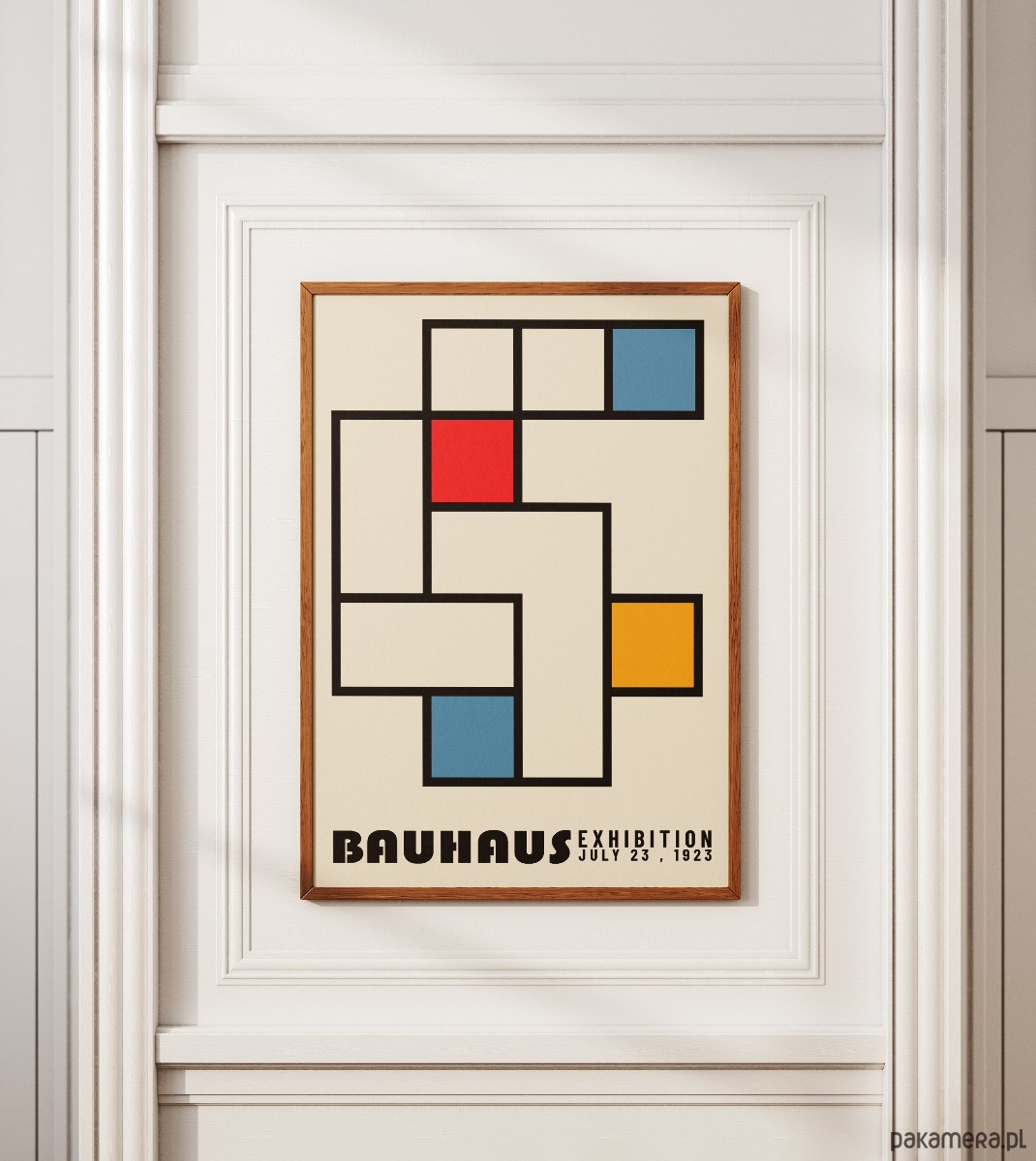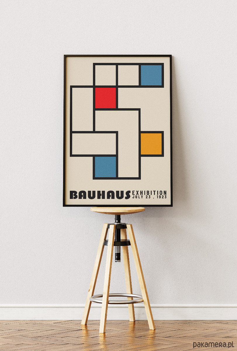 Plakat stanowi esencję modernistycznego minimalizmu, nawiązując do kultowej wystawy z lipca 1923 roku. Kompozycja opiera się na matematycznym porządku czarnych linii, które wyznaczają przestrzeń dla podstawowych barw Bauhausu: nasyconej czerwieni, głębokiego błękitu oraz słonecznej żółci. To surowa, a zarazem dynamiczna gra figur geometrycznych, która w pełni oddaje ideę „formy podążającej za funkcją”.