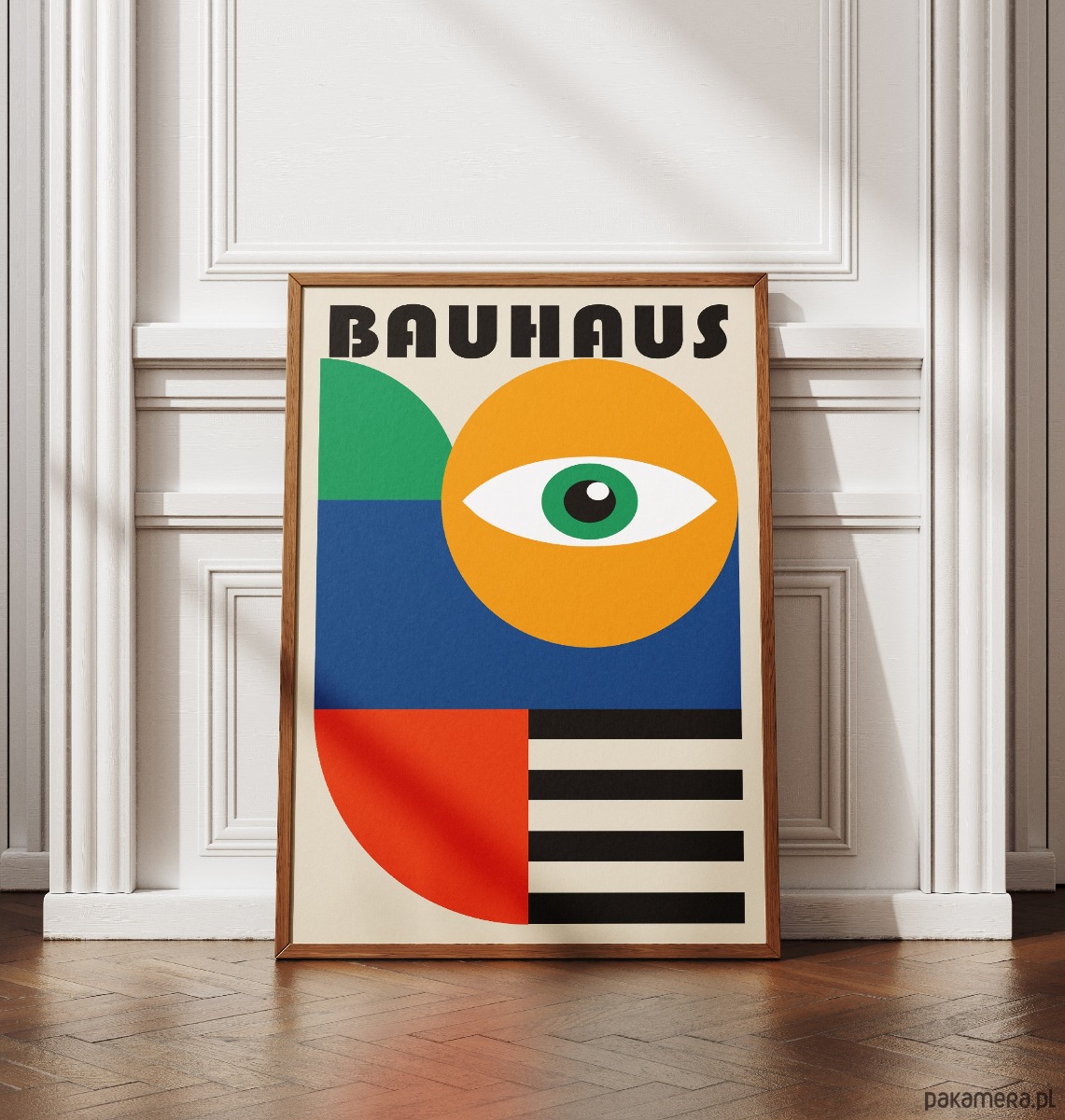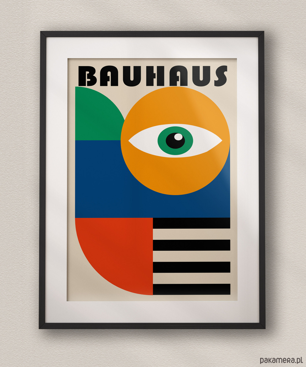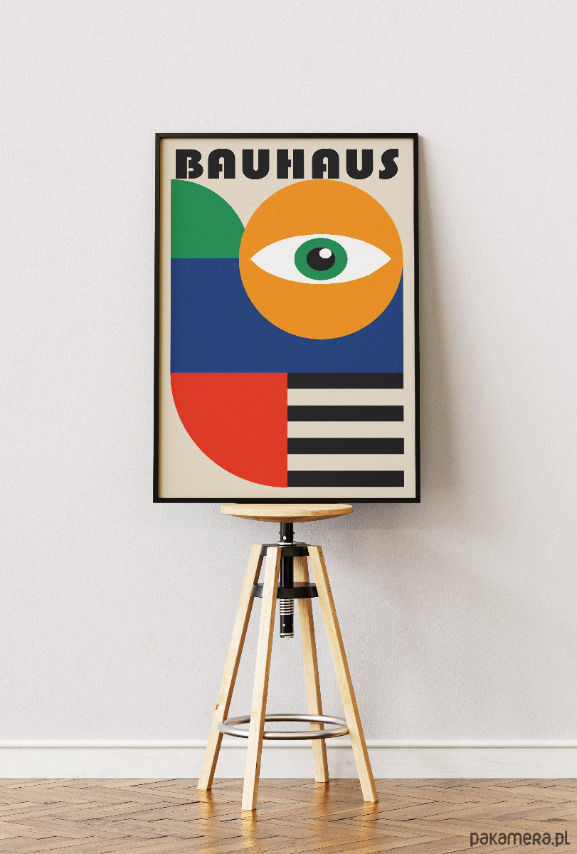 Plakat to kwintesencja geometrii Bauhausu, łącząca symboliczne oko z surowymi formami abstrakcyjnymi. Kompozycja bazuje na silnych kontrastach: słonecznym żółtym kole, głębokim błękicie i czerwieni oraz rytmicznych, czarnych pasach. To projekt, który w nowoczesny sposób interpretuje klasykę modernizmu, stawiając na balans między organicznym symbolem a techniczną strukturą graficzną.