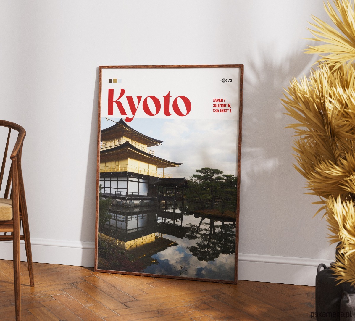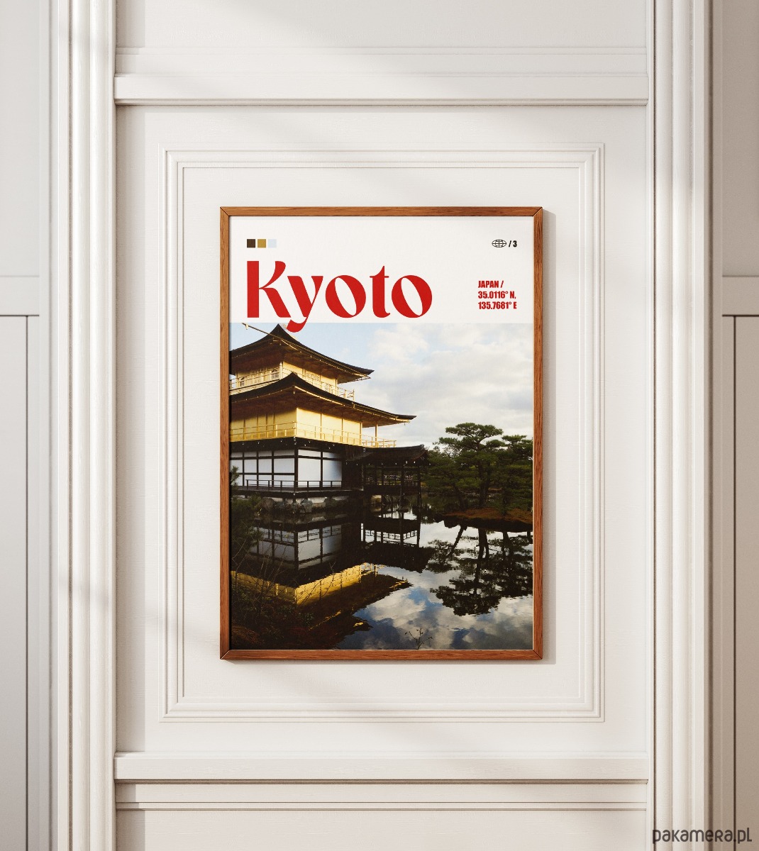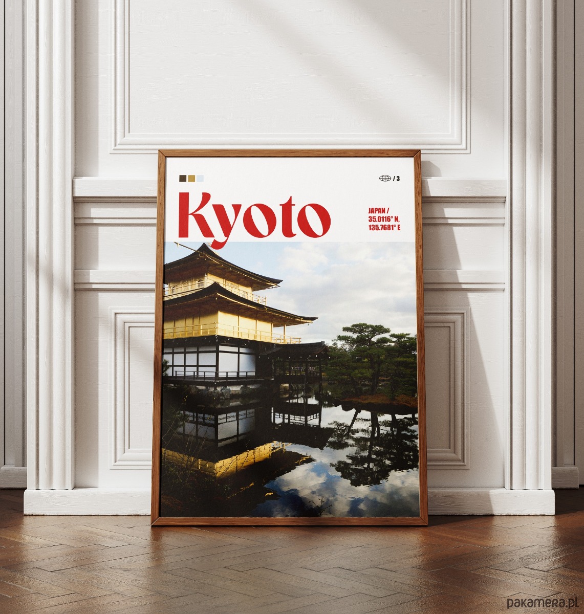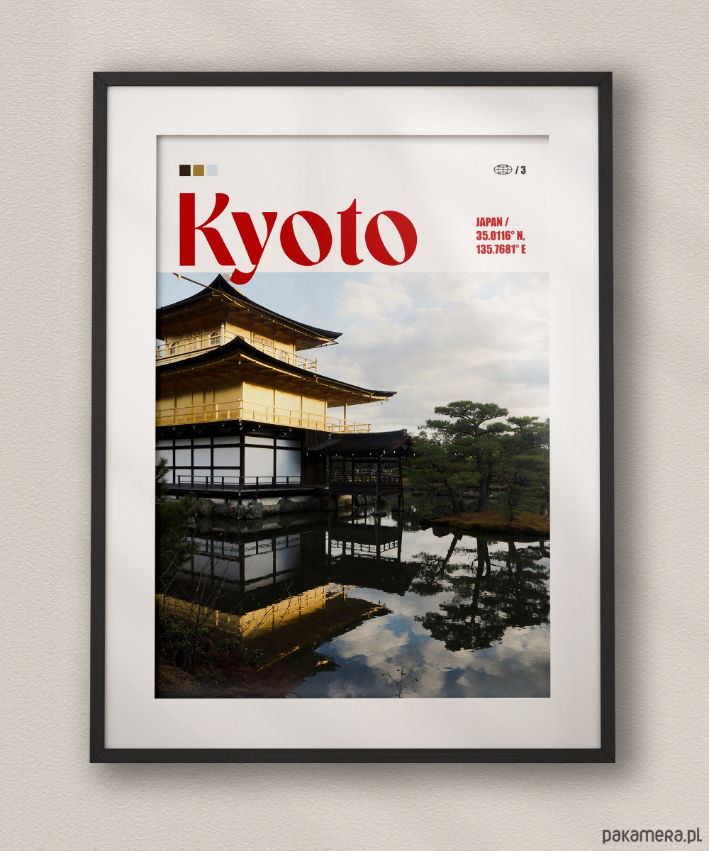 Plakat przedstawiający Złoty Pawilon (Kinkaku-ji) w Kioto, uchwycony wraz z jego lustrzanym odbiciem w tafli otaczającego go stawu. Fotografia ukazuje kontrast między lśniącą, złotą strukturą świątyni a naturalnym otoczeniem tradycyjnego japońskiego ogrodu. Górną część projektu zajmuje wyrazista, czerwona typografia oraz minimalistyczne detale techniczne, nawiązujące do japońskiej estetyki flagi i słońca.