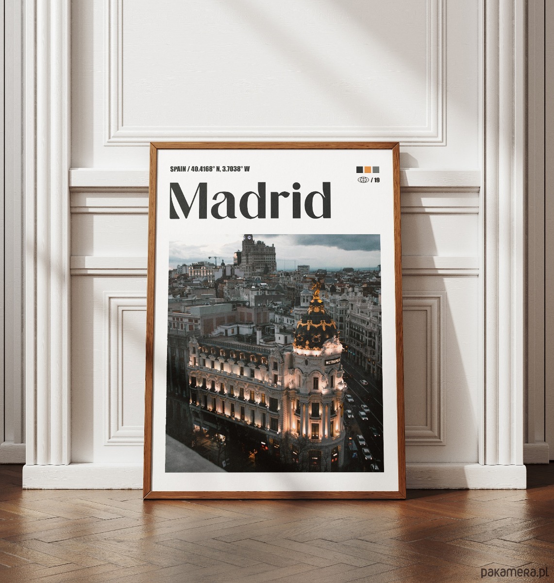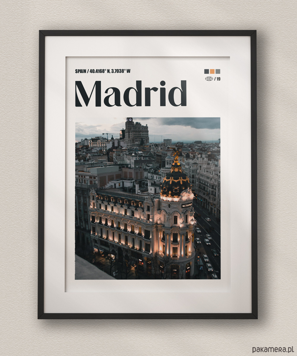 Plakat przedstawia monumentalny budynek Metropolis – jeden z najbardziej rozpoznawalnych symboli architektury Madrytu. Zdjęcie ukazuje bogato zdobioną fasadę z charakterystyczną kopułą zwieńczoną złotymi detalami, górującą nad skrzyżowaniem ulic Calle de Alcalá i Gran Vía. Fotografia jest utrzymana w nastrojowej, wieczornej tonacji z ciepłym oświetleniem budynku kontrastującym z chłodnym, zmierzchowym niebem.