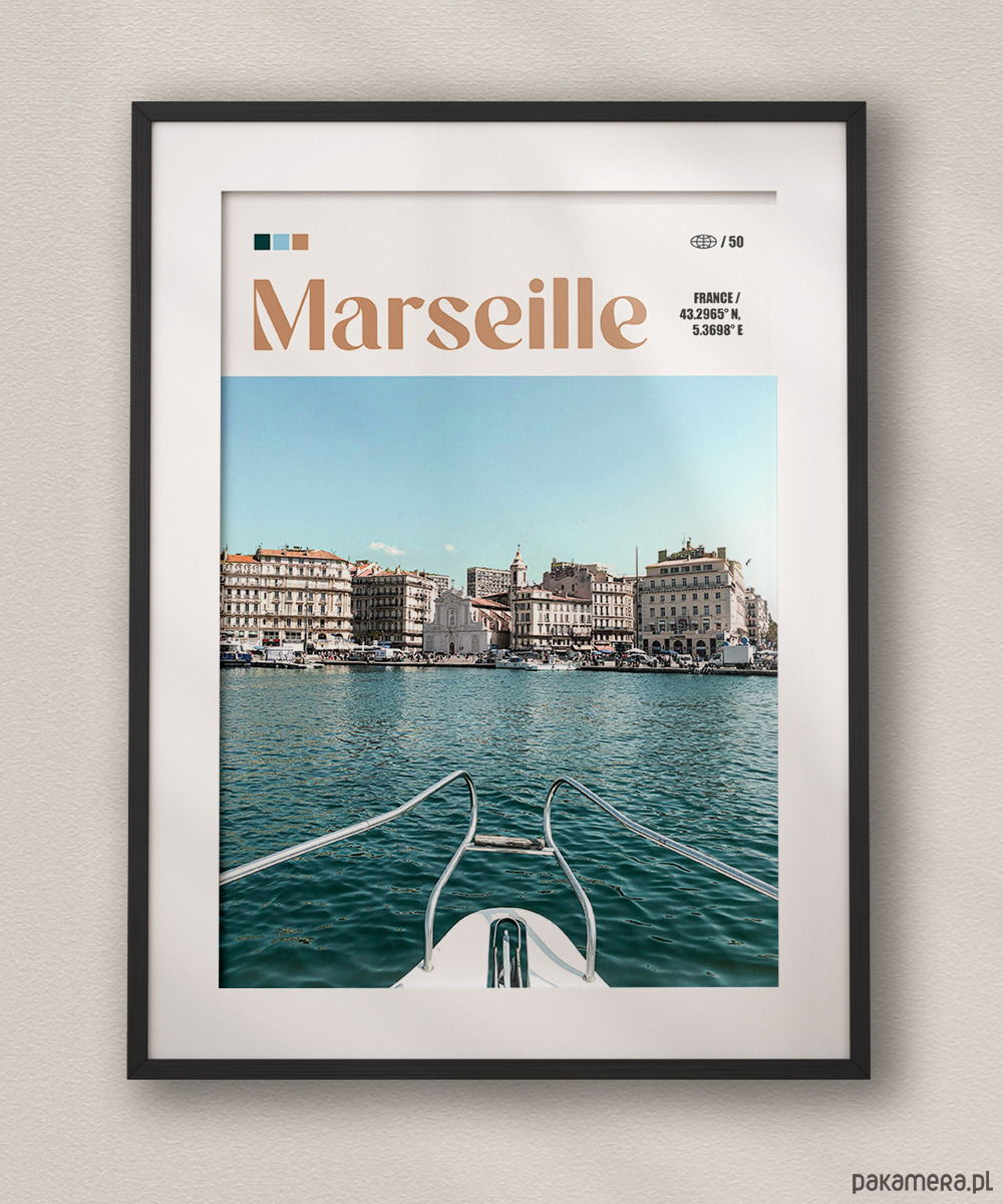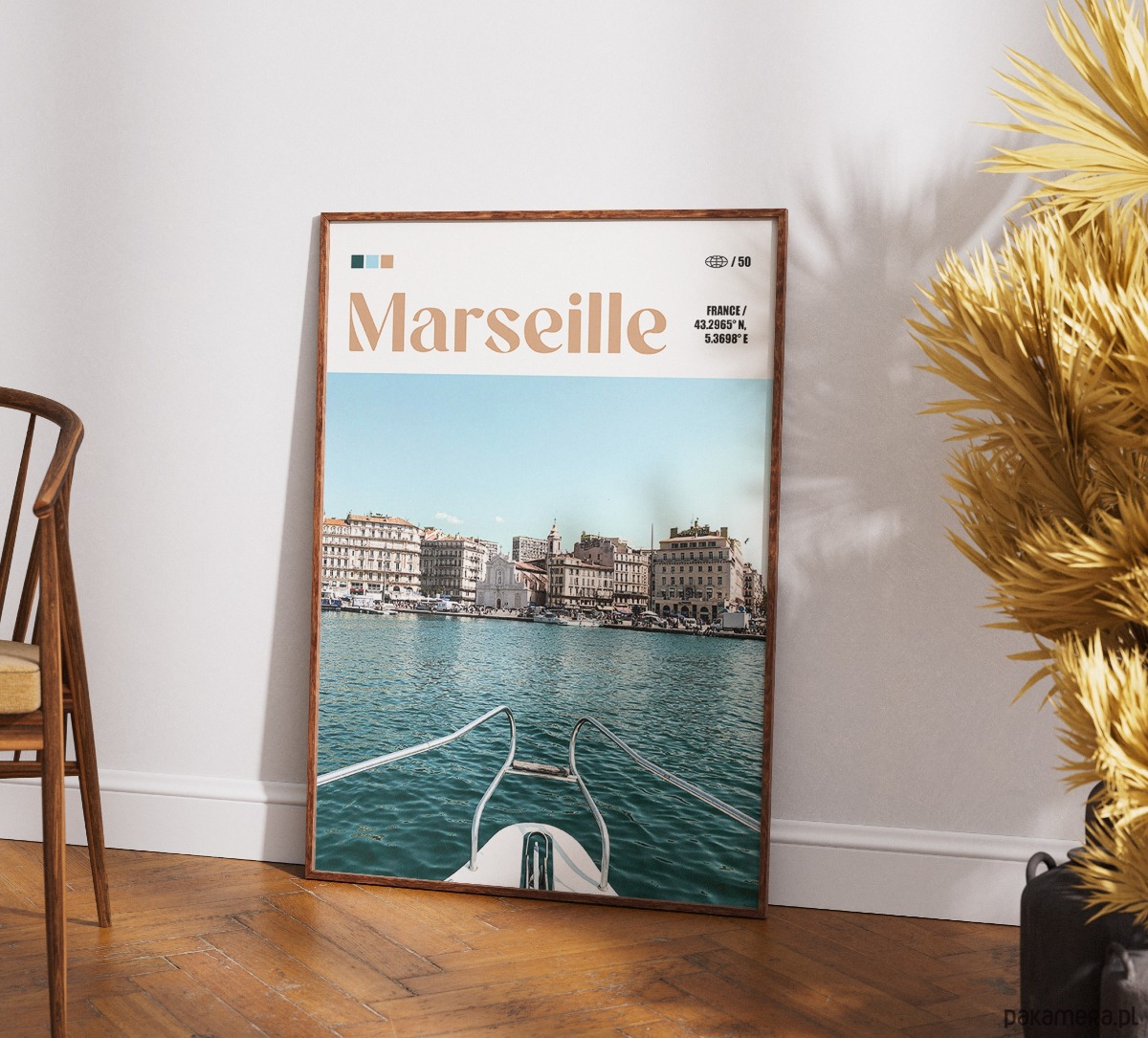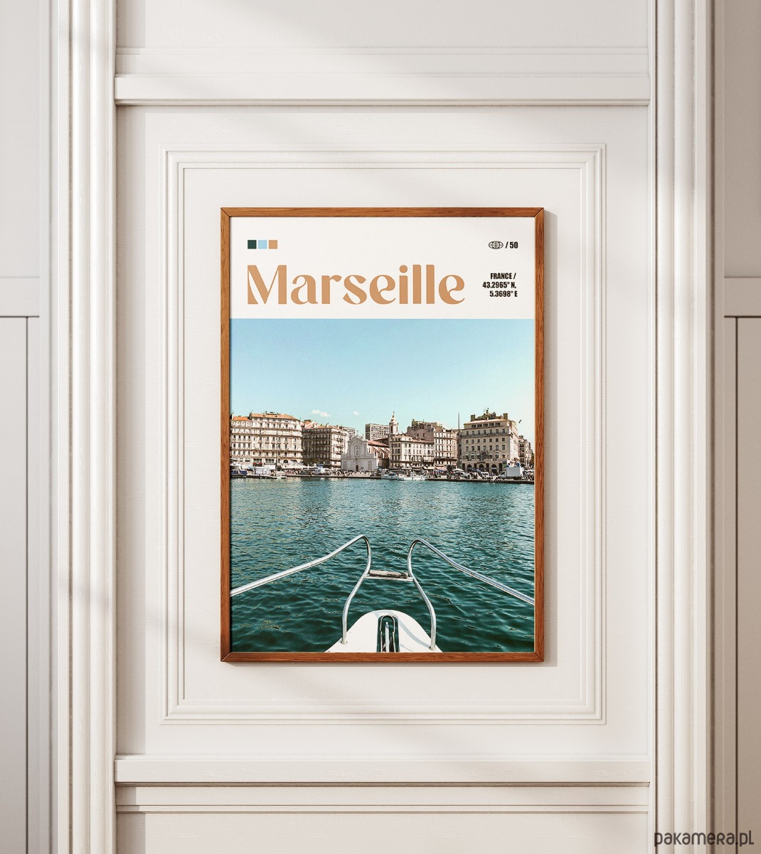 Marsylia to najstarsze miasto Francji i tętniąca życiem brama do Morza Śródziemnego. Plakat przedstawia widok z perspektywy łodzi na Stary Port (Vieux Port), gdzie historyczna zabudowa miesza się z błękitem wody. Miasto słynie z unikalnego połączenia prowansalskiego słońca, surowej portowej architektury i wielokulturowej energii. To idealny wybór dla osób ceniących południowy klimat, morską bryzę i autentyczny, niepodrabialny charakter Lazurowego Wybrzeża.