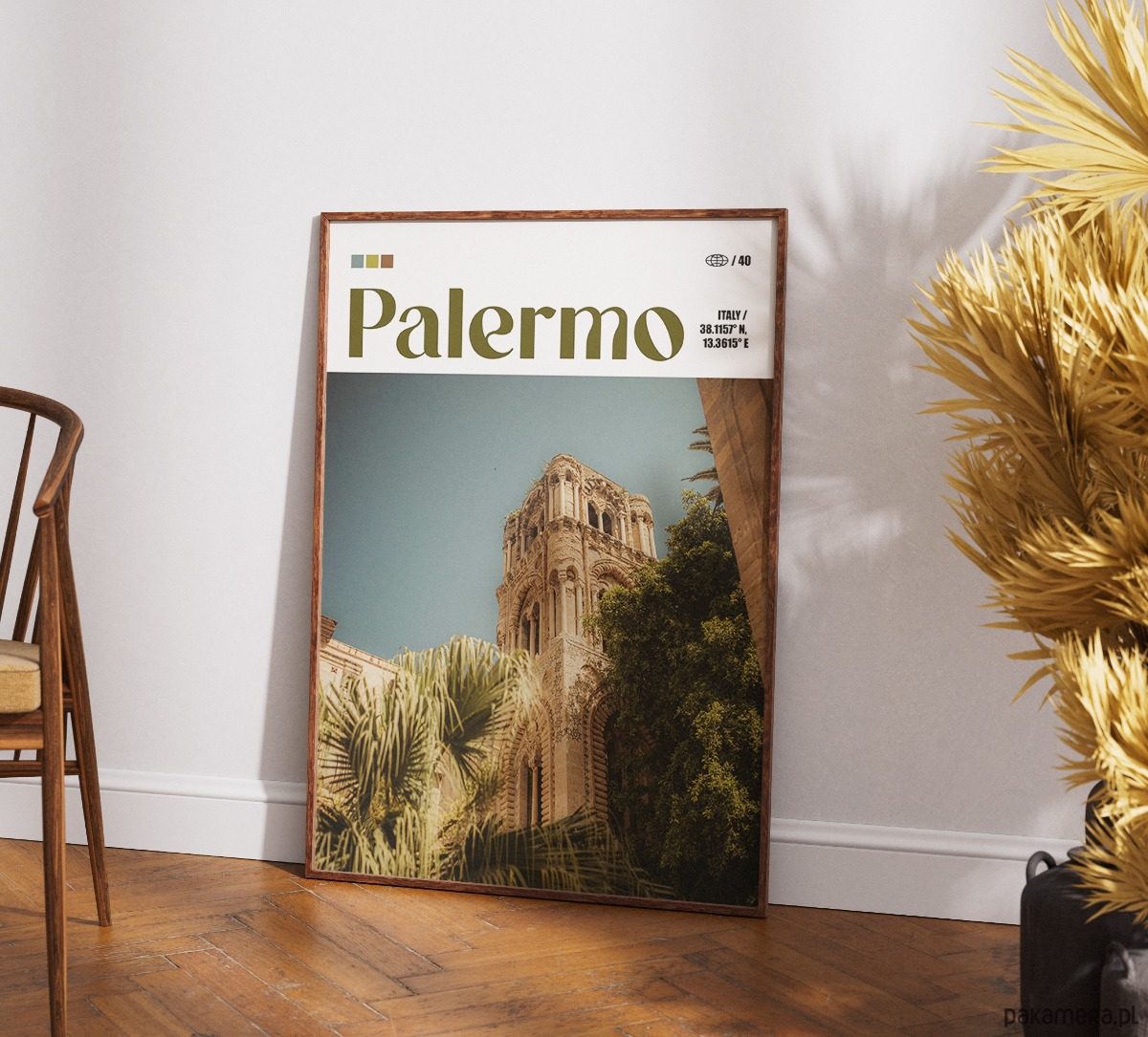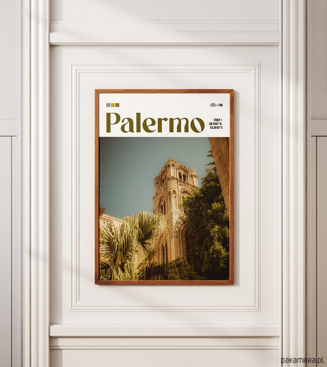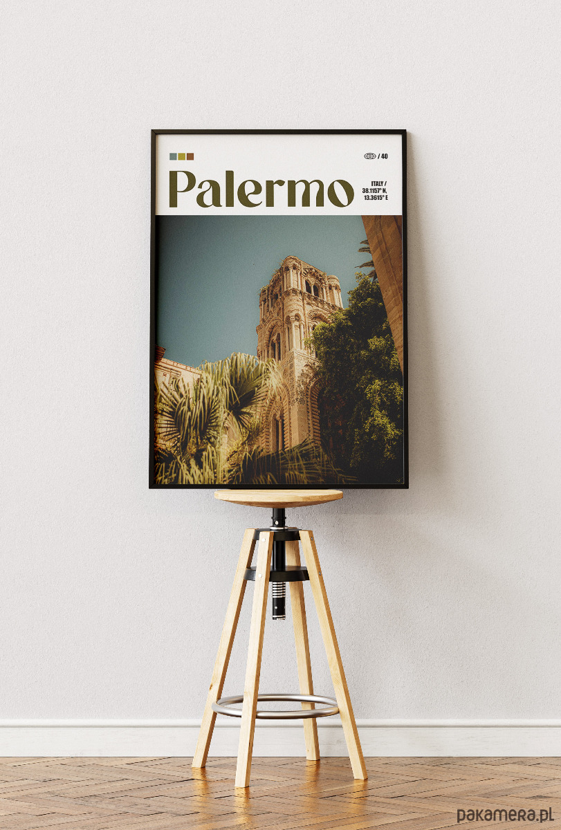 Palermo to fascynująca mozaika kultur, gdzie słońce Sycylii oświetla surowe piękno normańskiej architektury i bujną śródziemnomorską roślinność. Plakat oddaje unikalny, nostalgiczny klimat miasta, w którym historyczne mury spotykają się z egzotycznymi palmami pod bezchmurnym niebem. To miejsce pełne kontrastów, słynące z intensywnych smaków, barokowych kościołów i autentycznej, południowej duszy, która wnosi do wnętrza ciepło i spokój.