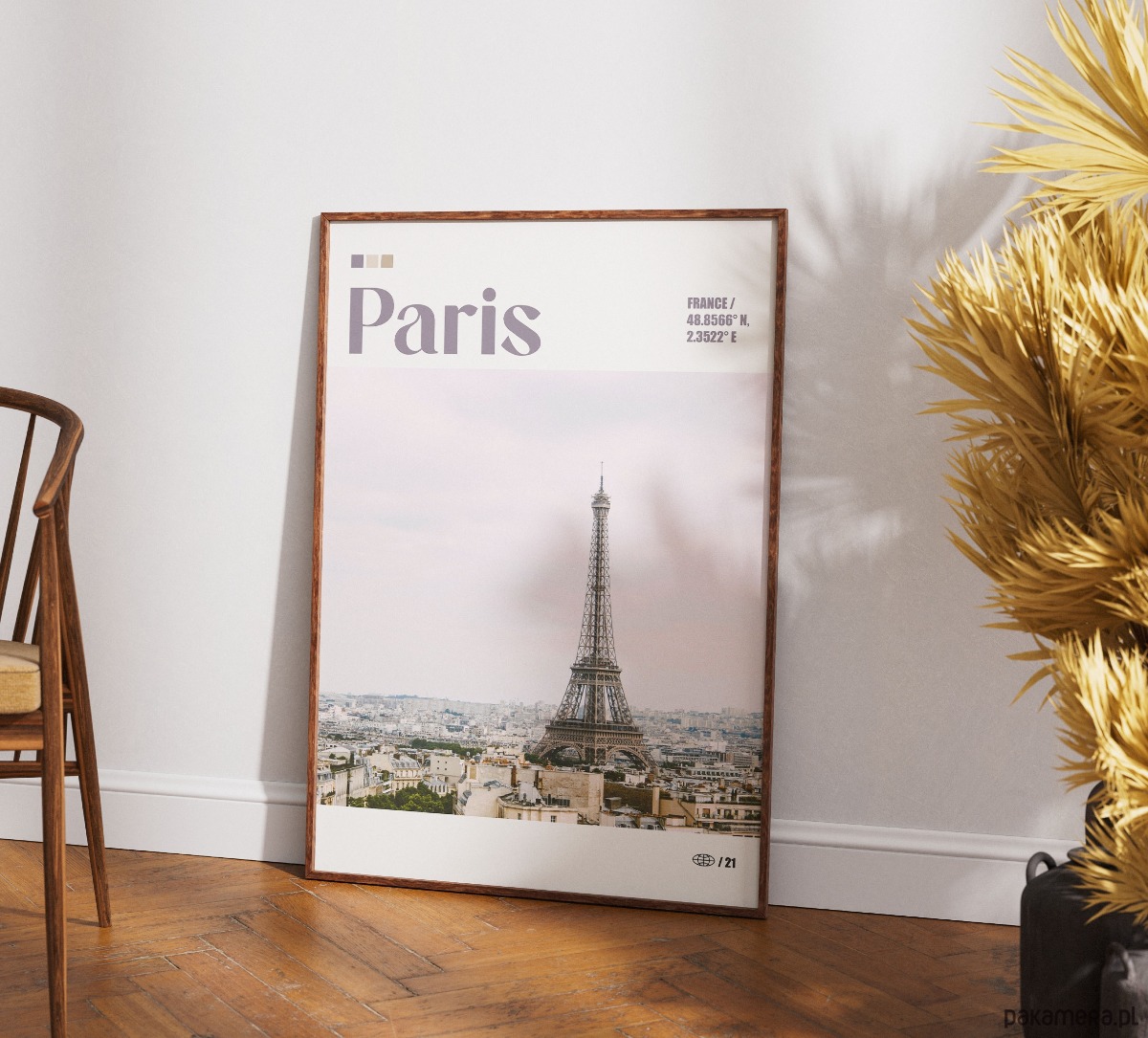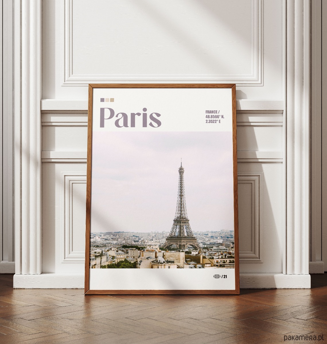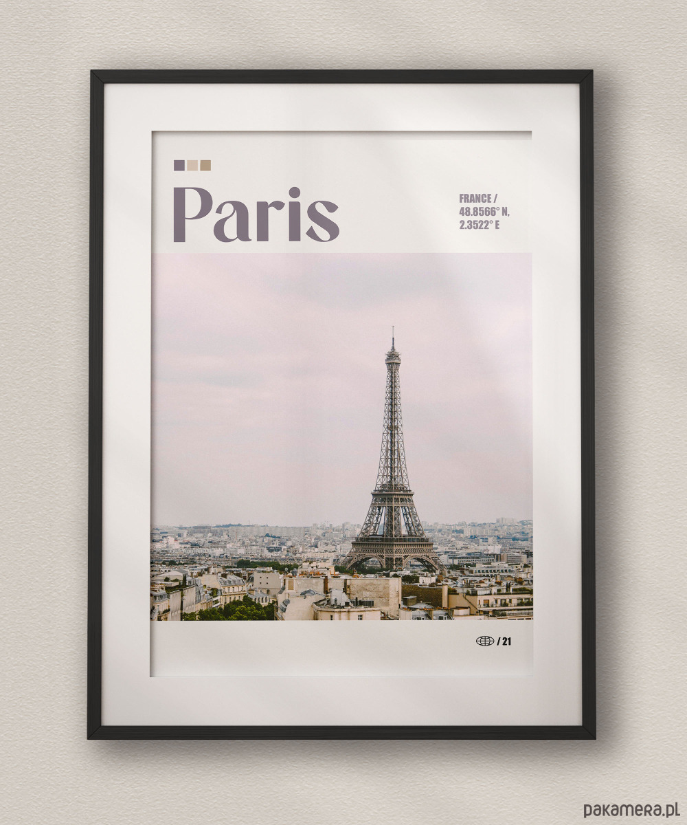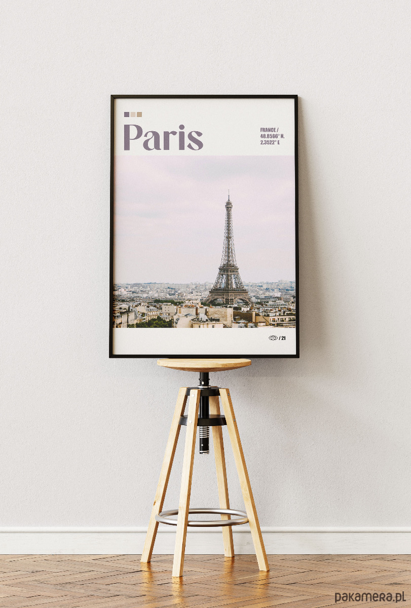 Plakat przedstawia ikoniczną panoramę Paryża z Wieżą Eiffla jako głównym punktem kompozycji. Zdjęcie ukazuje gęstą zabudowę kamienic z charakterystycznymi mansardowymi dachami, rozciągającą się aż po horyzont pod jasnym, lekko zamglonym niebem. Fotografia jest utrzymana w delikatnej, pastelowej tonacji z przewagą chłodnych szarości i beżów, co nadaje jej elegancki, paryski klimat.