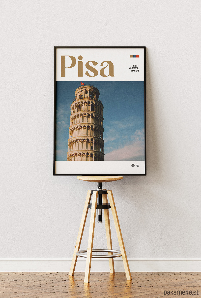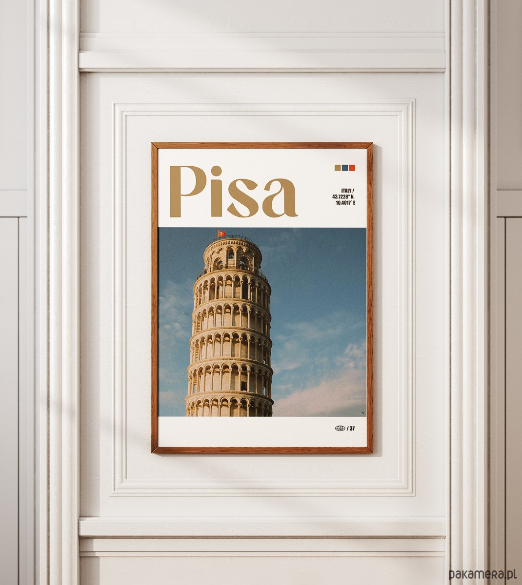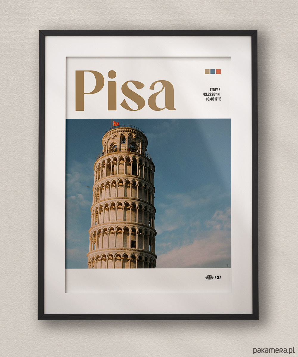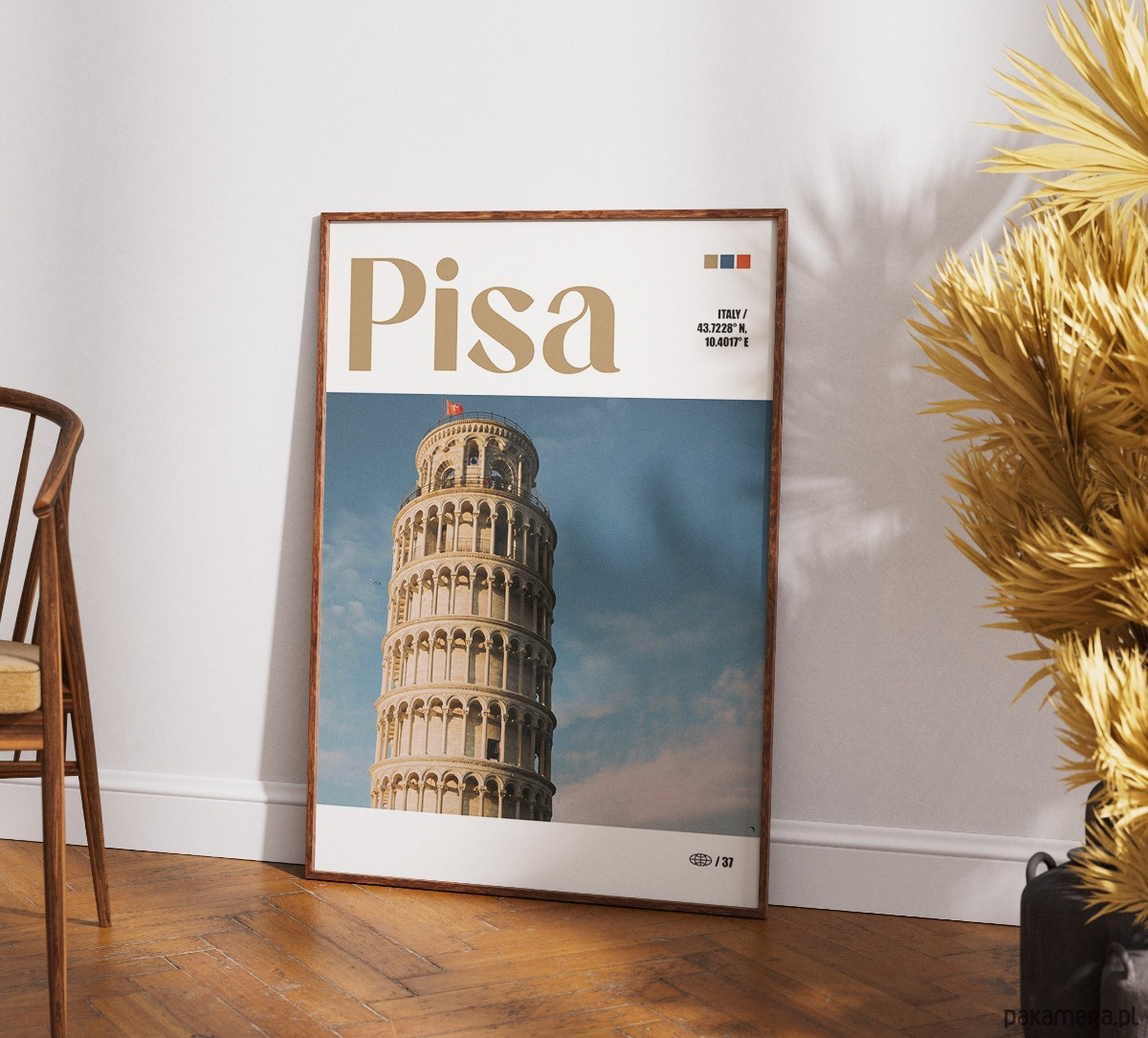 Piza to jedno z najbardziej rozpoznawalnych miast Toskanii, nierozerwalnie kojarzone z architektonicznym fenomenem Placu Cudów. Plakat przedstawia ikoniczną Krzywą Wieżę (Torre Pendente) na tle głębokiego, włoskiego nieba, podkreślając jej unikalną geometrię i kunszt romańskich zdobień. Miasto to nie tylko światowej sławy zabytek, ale także historyczna potęga morska i prestiżowy ośrodek uniwersytecki o spokojnym, toskańskim rytmie. Grafika idealnie wpisuje się w klasyczne i nowoczesne wnętrza, dodając im elegancji oraz śródziemnomorskiego słońca.