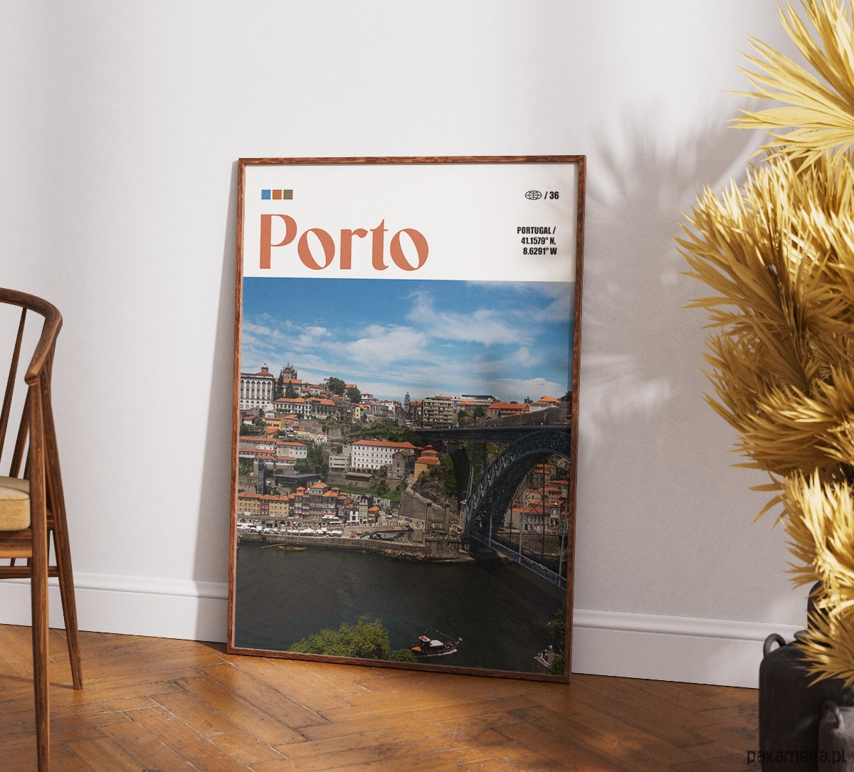 Porto to miasto o niezwykłym charakterze, malowniczo rozciągnięte nad brzegami rzeki Douro. Plakat przedstawia panoramę historycznej dzielnicy Ribeira wraz z ikonicznym, stalowym mostem Ponte Dom Luís I, który jest symbolem portugalskiej inżynierii i kunsztu. Miasto słynie z kaskadowej zabudowy kolorowych kamienic, aromatycznego wina oraz unikalnej atmosfery, w której tradycja miesza się z nowoczesnością. Ta grafika wprowadza do wnętrza klimat spokoju, nostalgii i elegancji, idealnie oddając duszę jednego z najpiękniejszych miast Europy.