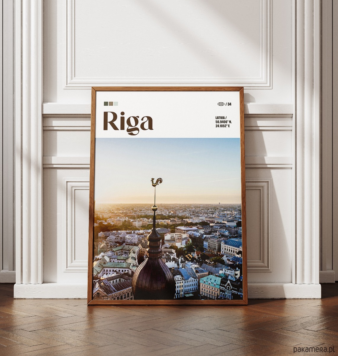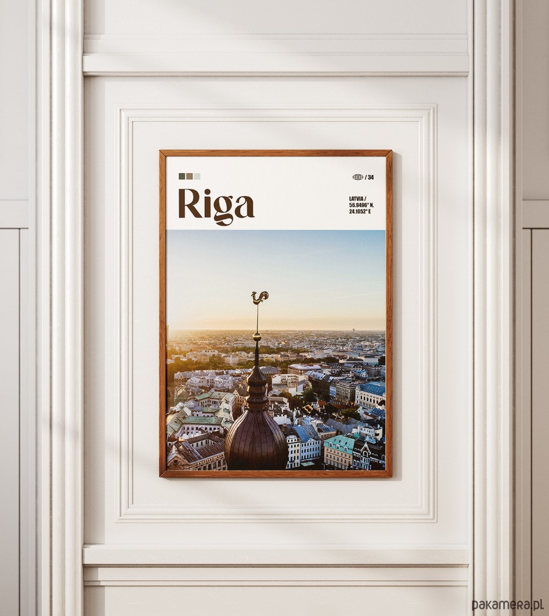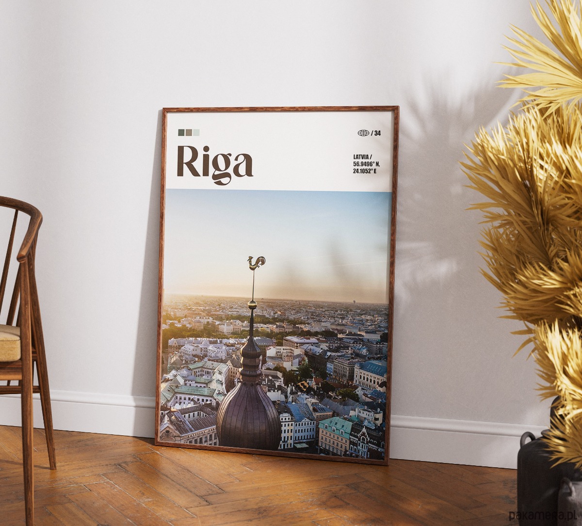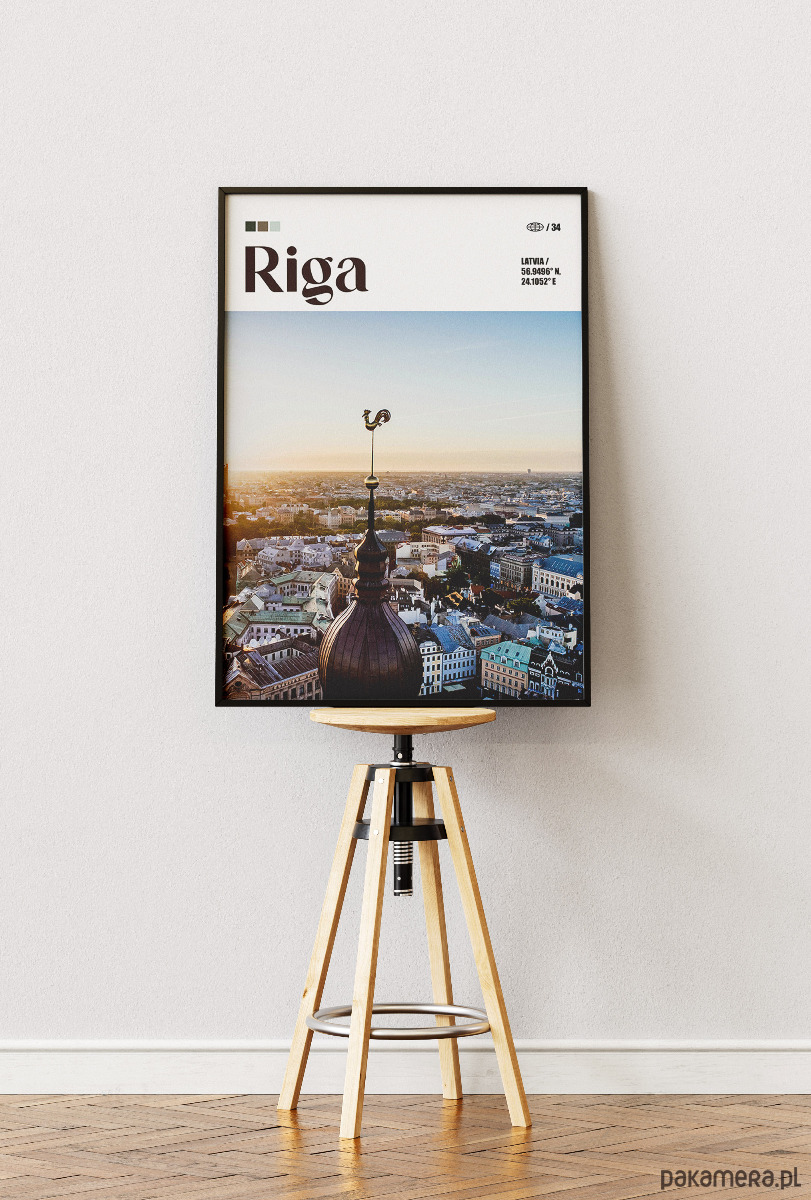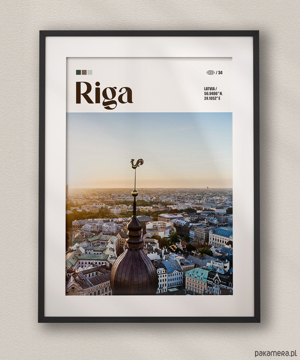 Ryga, największa metropolia krajów bałtyckich, to miasto, w którym surowy gotyk spotyka się z najbardziej imponującą kolekcją architektury secesyjnej w Europie. Plakat przedstawia panoramę starego miasta z perspektywy wieży kościoła św. Piotra, zwieńczonej charakterystycznym złotym kogutem – symbolem czujności i ochrony. Miasto zachwyca spokojnym, północnym klimatem, zabytkowymi kamienicami i bliskością morza. Grafika wnosi do wnętrza powiew bałtyckiej elegancji i historycznej głębi.