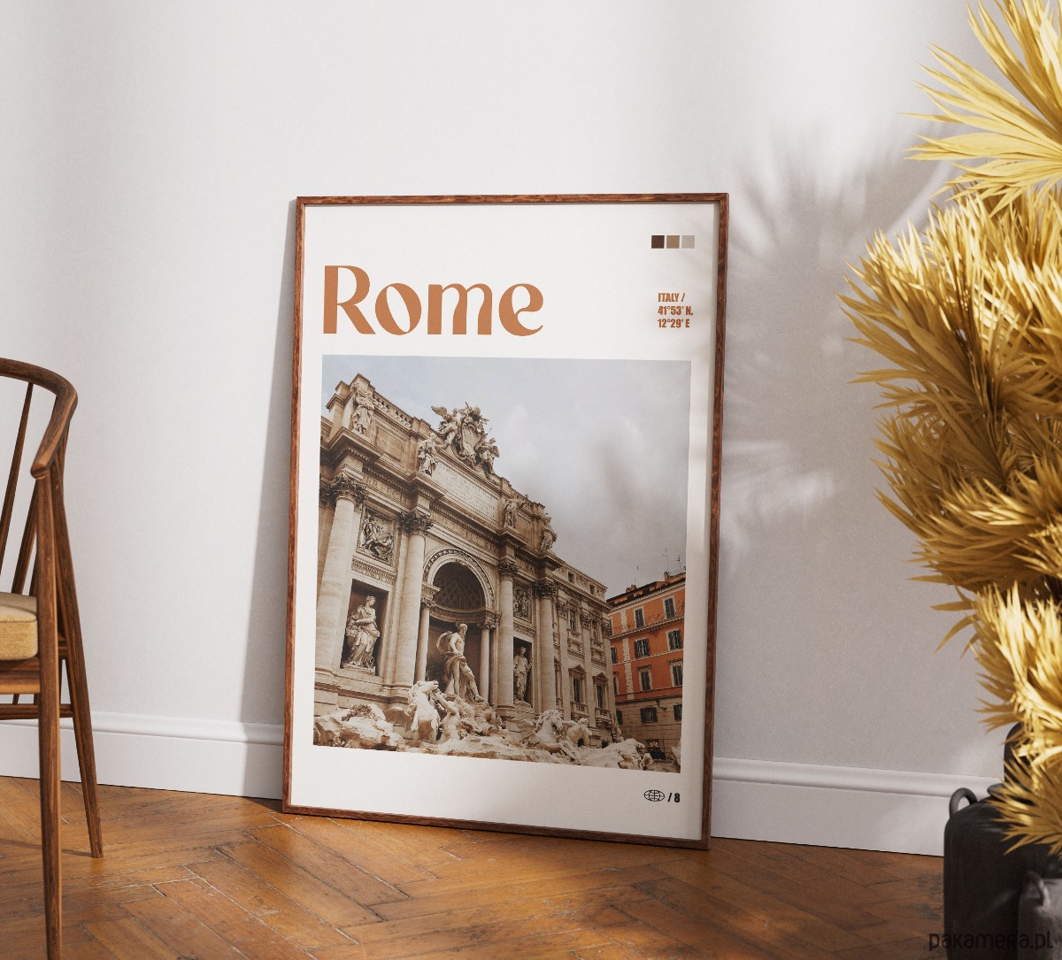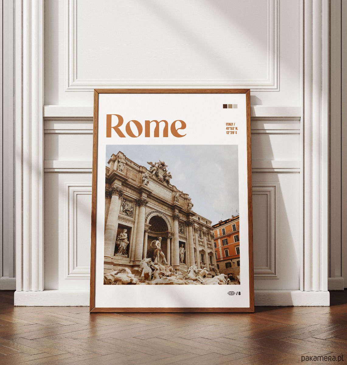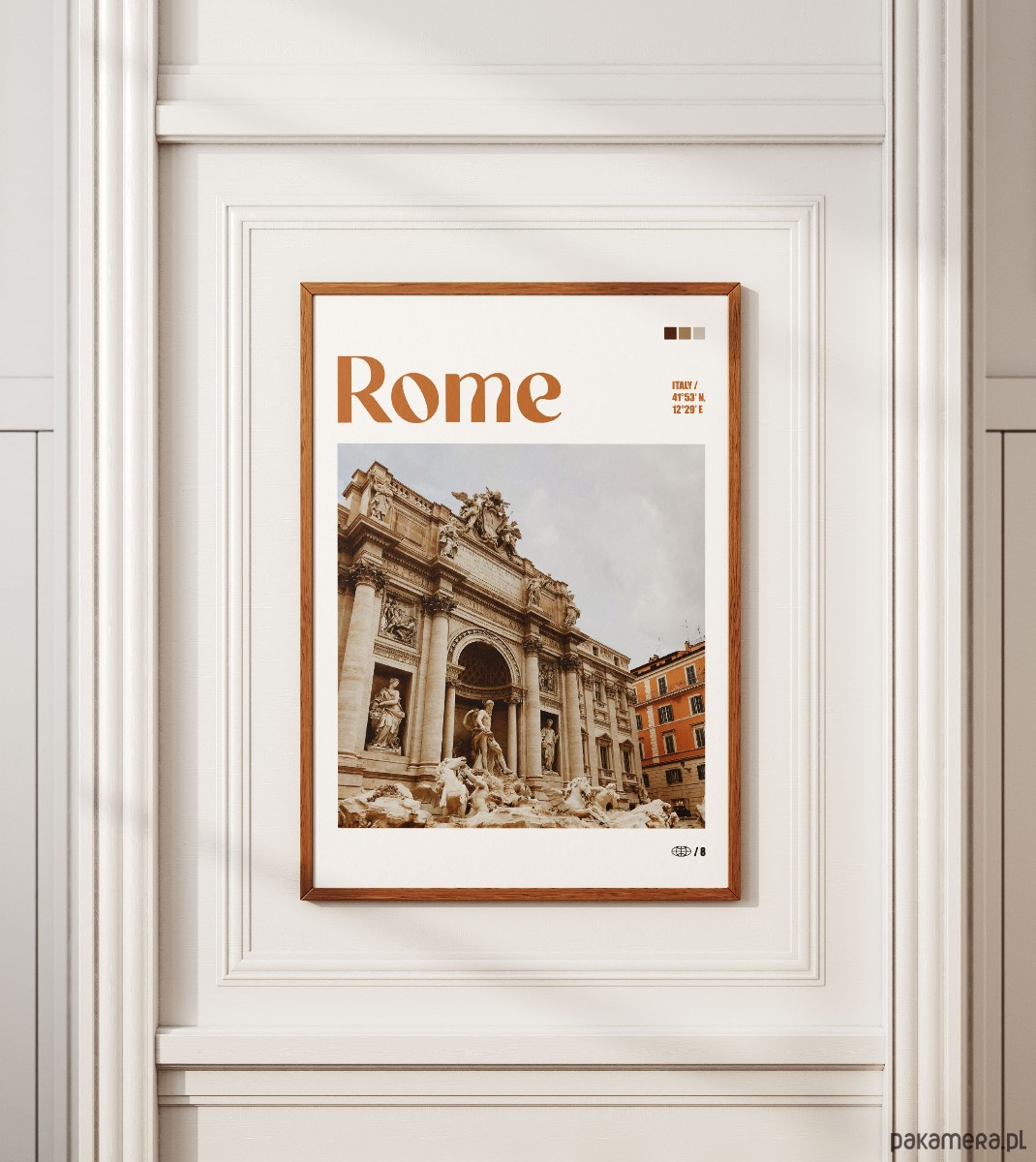 Plakat przedstawia monumentalną Fontannę di Trevi, jeden z najsłynniejszych symboli barokowej architektury Rzymu. Zdjęcie ukazuje bogato rzeźbioną fasadę z centralną postacią Okeanosa oraz kaskady wody spływające po skalistych formacjach. Fotografia jest utrzymana w ciepłej, beżowo-brązowej tonacji, podkreślającej szlachetność trawertynu i zabytkowy charakter Wiecznego Miasta.
