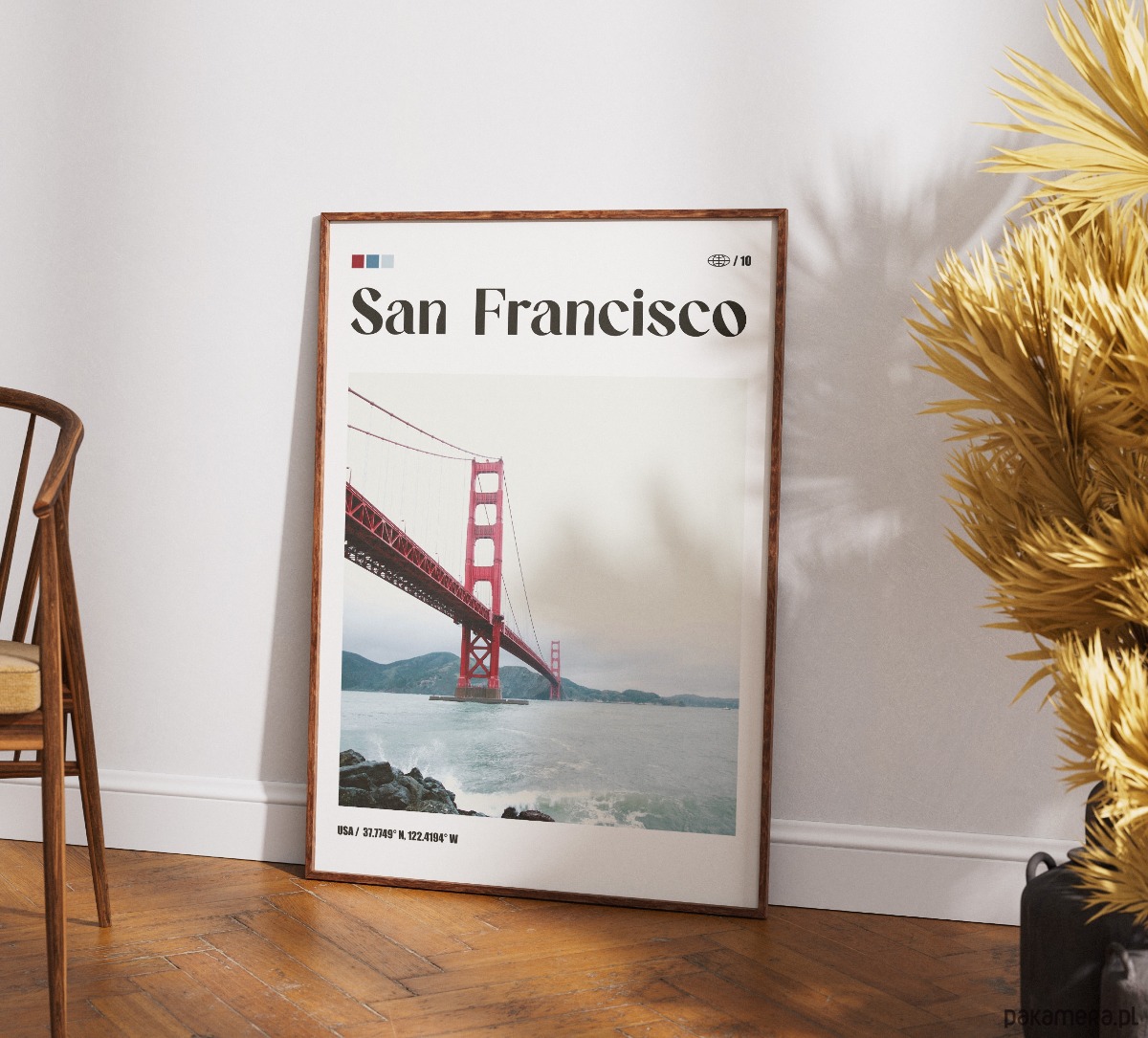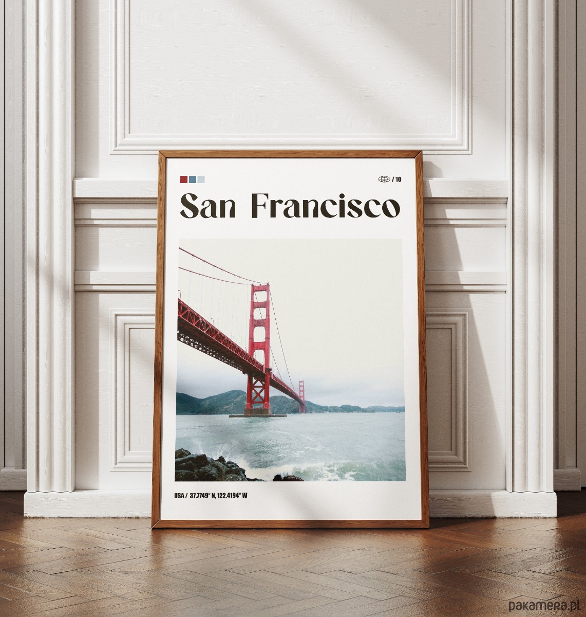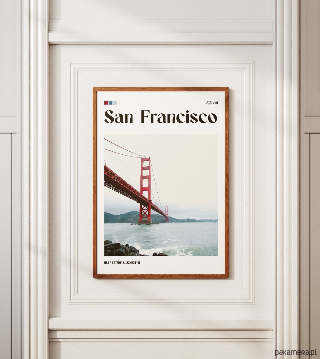 Projekt dla entuzjastów architektury inżynieryjnej i surowej estetyki wybrzeża USA. Dzięki zestawieniu intensywnego koloru konstrukcji z chłodną tonacją tła, plakat stanowi wyrazisty akcent do nowoczesnego salonu lub gabinetu. Świetny wybór dla osób szukających w sztuce użytkowej autentyzmu i geometrycznego porządku.