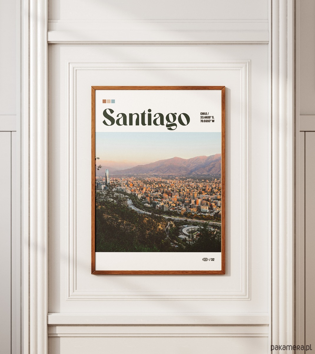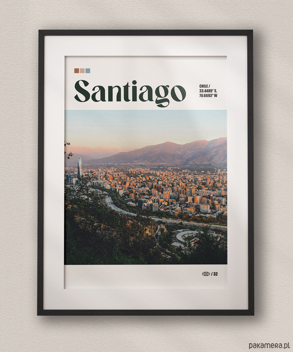 Santiago to dynamiczna stolica położona u stóp potężnych Andów, których ośnieżone szczyty tworzą spektakularne tło dla nowoczesnej architektury miasta. Plakat przedstawia panoramę metropolii skąpaną w ciepłym świetle zachodzącego słońca, z widocznym wieżowcem Gran Torre Santiago – najwyższym budynkiem Ameryki Południowej. Miasto łączy w sobie latynoską energię z elegancją kolonialnych zabytków i zielenią parków na wzgórzach.
