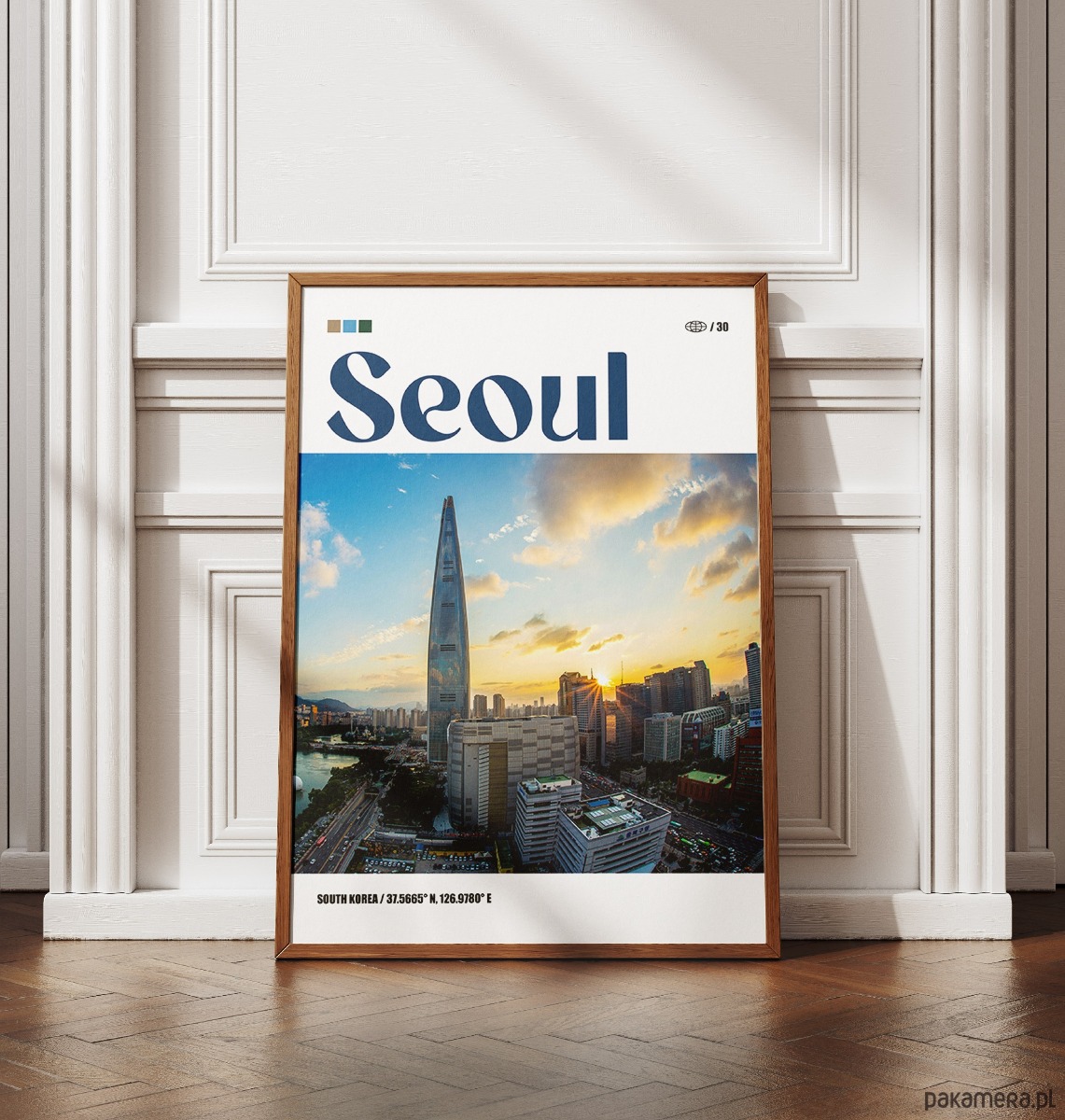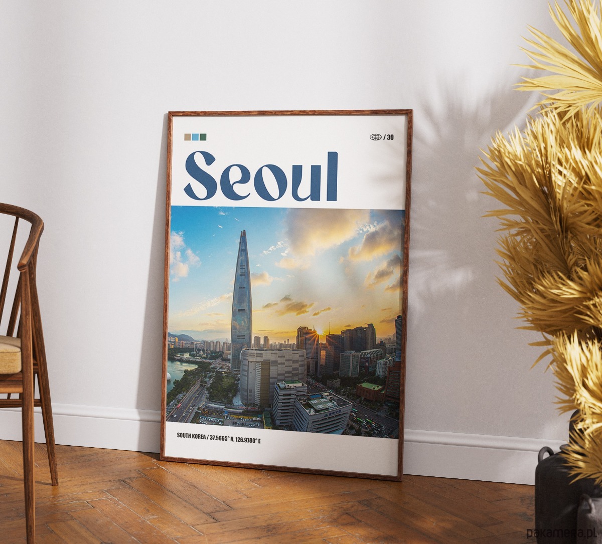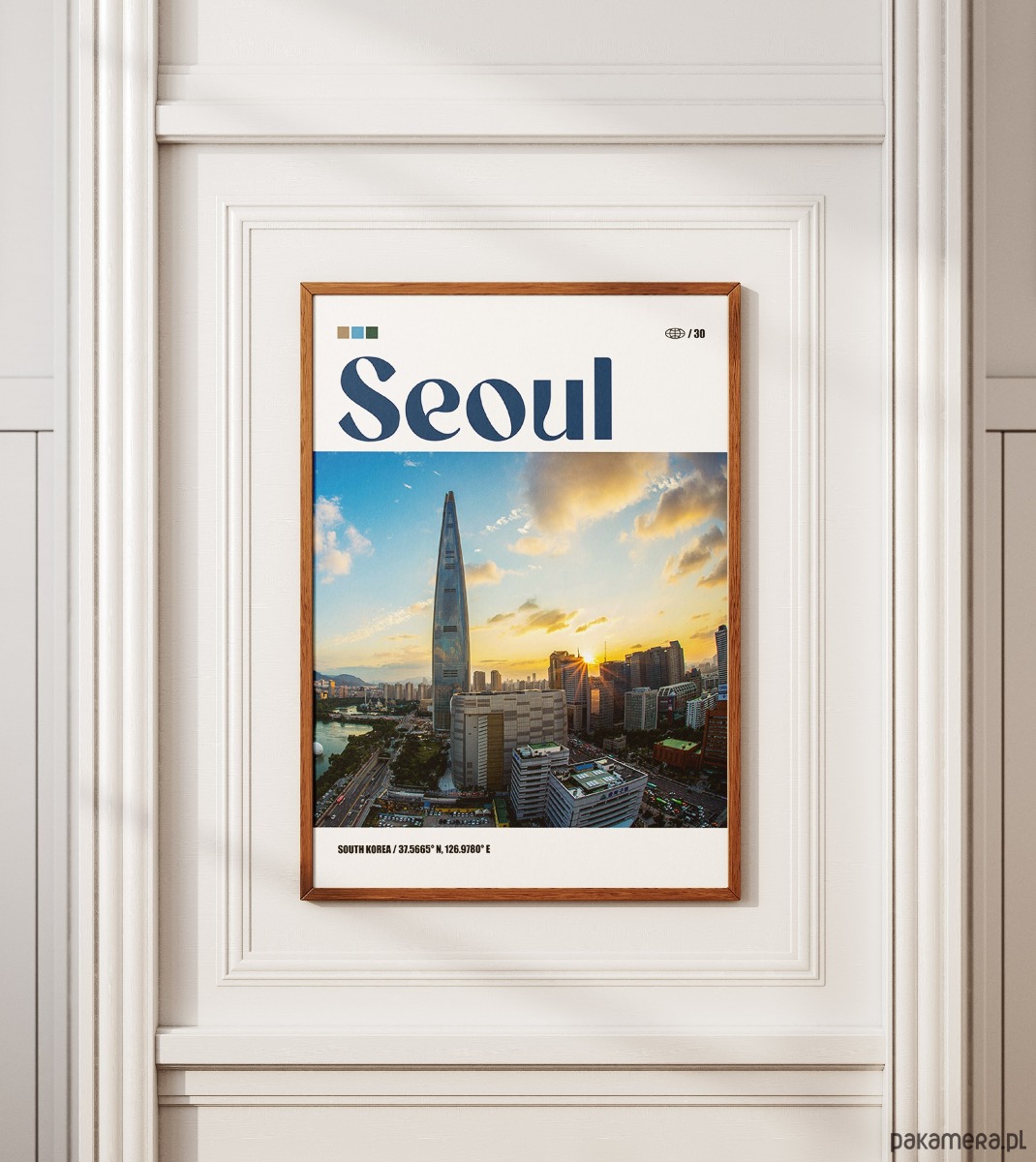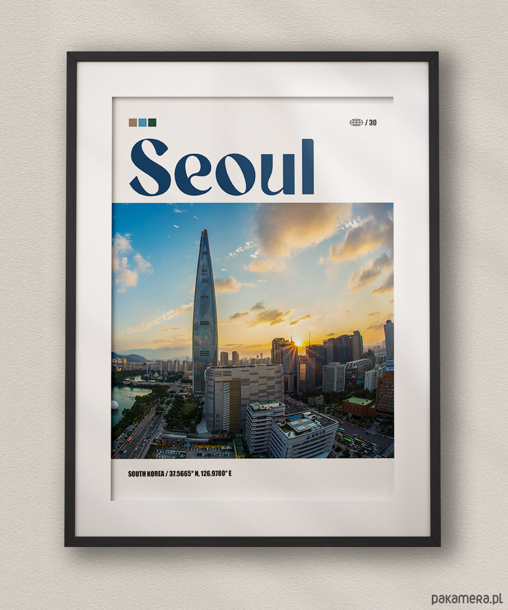 Seul to fascynująca megametropolia, w której ultranowoczesna technologia współistnieje z wielowiekową tradycją. Plakat przedstawia spektakularną panoramę miasta o zachodzie słońca, z dominującą sylwetką Lotte World Tower – jednego z najwyższych budynków świata. Seul to miasto, które nigdy nie zasypia, oferując unikalną mieszankę futurystycznych wieżowców, buddyjskich świątyń i tętniących życiem dzielnic takich jak Gangnam czy Myeong-dong. Ta grafika wprowadza do wnętrza dynamizm, wielkomiejski prestiż i ciepłą energię koreańskiego słońca.
