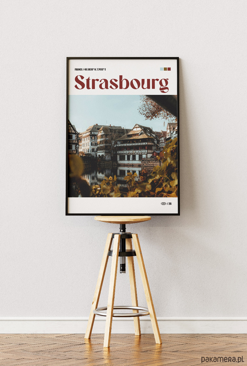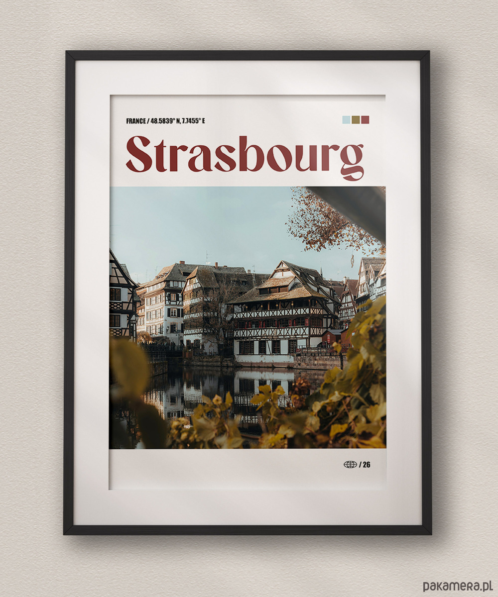 Strasburg to malownicza stolica Alzacji, będąca symbolem pojednania narodów i sercem europejskiej dyplomacji. Plakat ukazuje urokliwą dzielnicę "Petite France", gdzie tradycyjne domy z muru pruskiego odbijają się w spokojnych kanałach rzeki Ill. Miasto zachwyca unikalnym połączeniem wpływów francuskich i niemieckich, co widać w jego architekturze, kulturze oraz wyjątkowej atmosferze. Grafika ta wprowadza do wnętrza przytulny, niemal bajkowy klimat i elegancję historycznego europejskiego miasteczka.