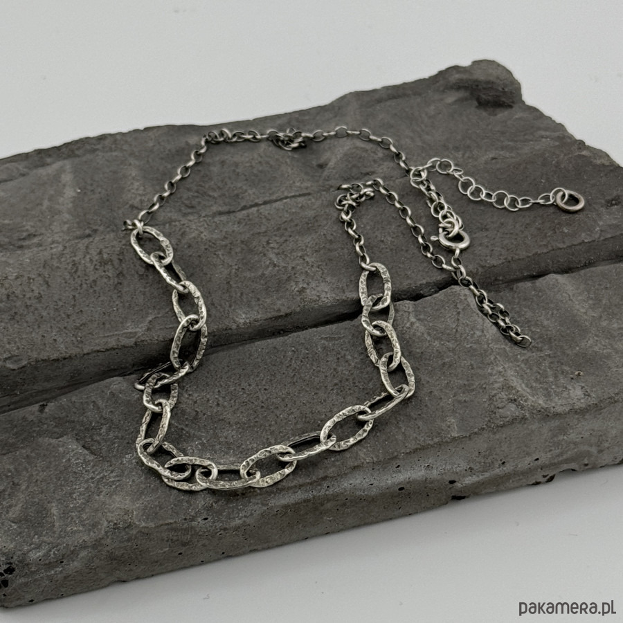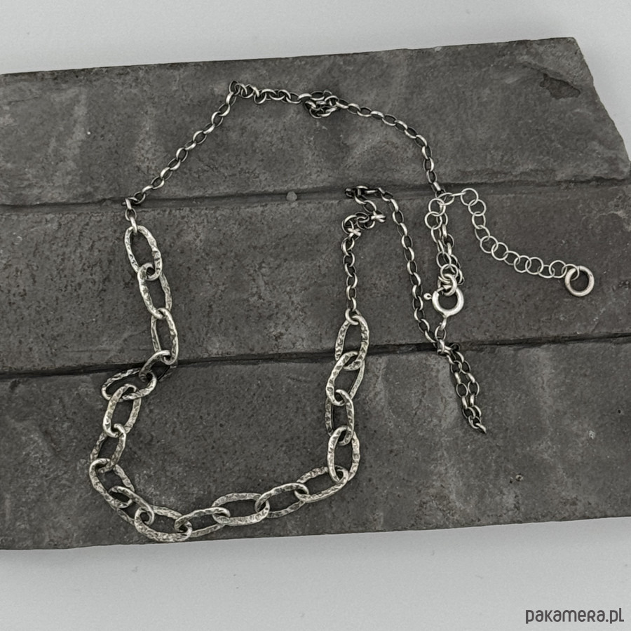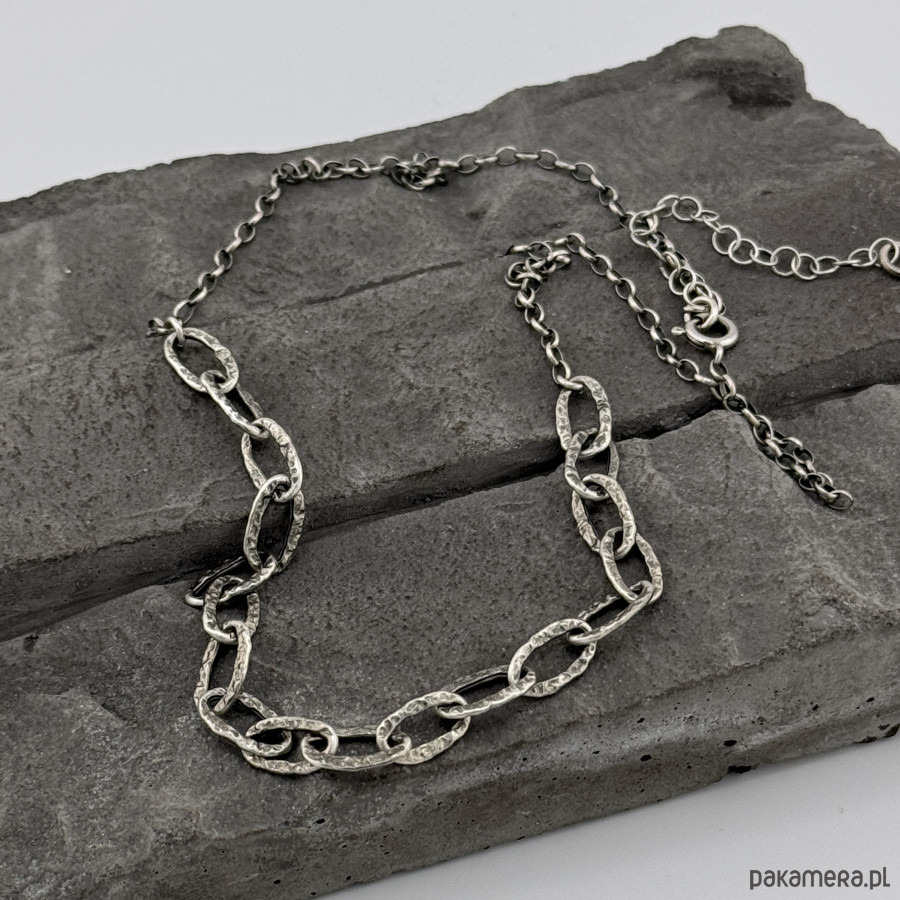 Subtelny, nowoczesny naszyjnik na co dzień i nie tylko. Wykonany w całości z oksydowanego srebra próby 925. Obwód łańcuszka to 45,5 cm plus regulacja 5 cm. Wielkość dużych, młotkowanych ogniw to 11x5,5 mm. W mojej galerii kolczyki i bransoletka do kompletu. Na życzenie mogę wykonać podobny naszyjnik bez oksydacji. Ozdobnie zapakowany.