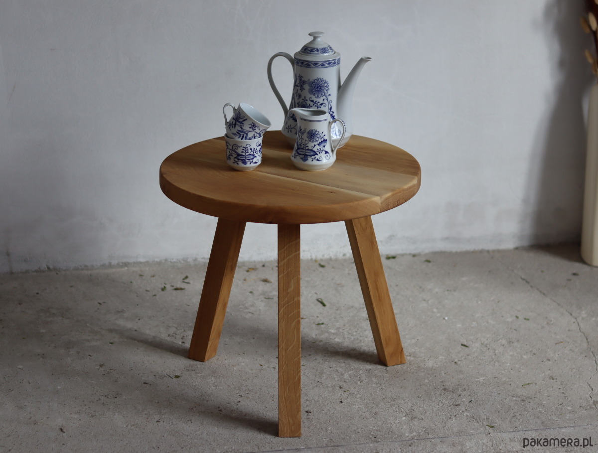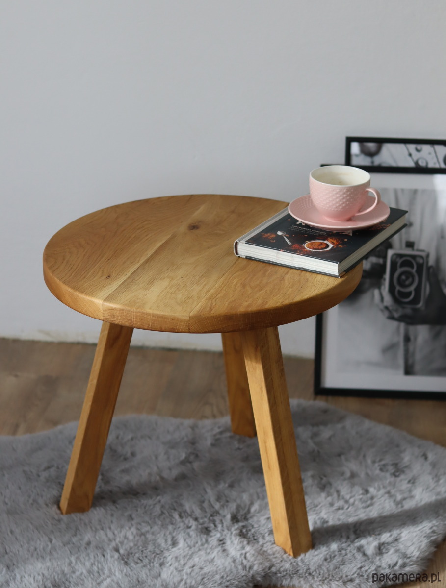 Ten stolik kawowy to minimalistyczny i elegancki mebel, idealny do współczesnych wnętrz. Wykonany jest z solidnego drewna dębu o jasnym odcieniu i wyraźnej strukturze sęków i słojów, co nadaje mu naturalny i ciepły charakter. Blat o zaokrąglonych krawędziach wsparty jest na trzech solidnych, prostokątnych nogach, które zapewniają stabilność i unikalny wygląd.