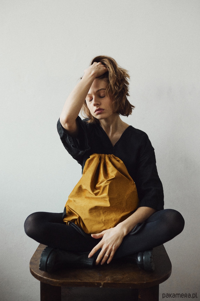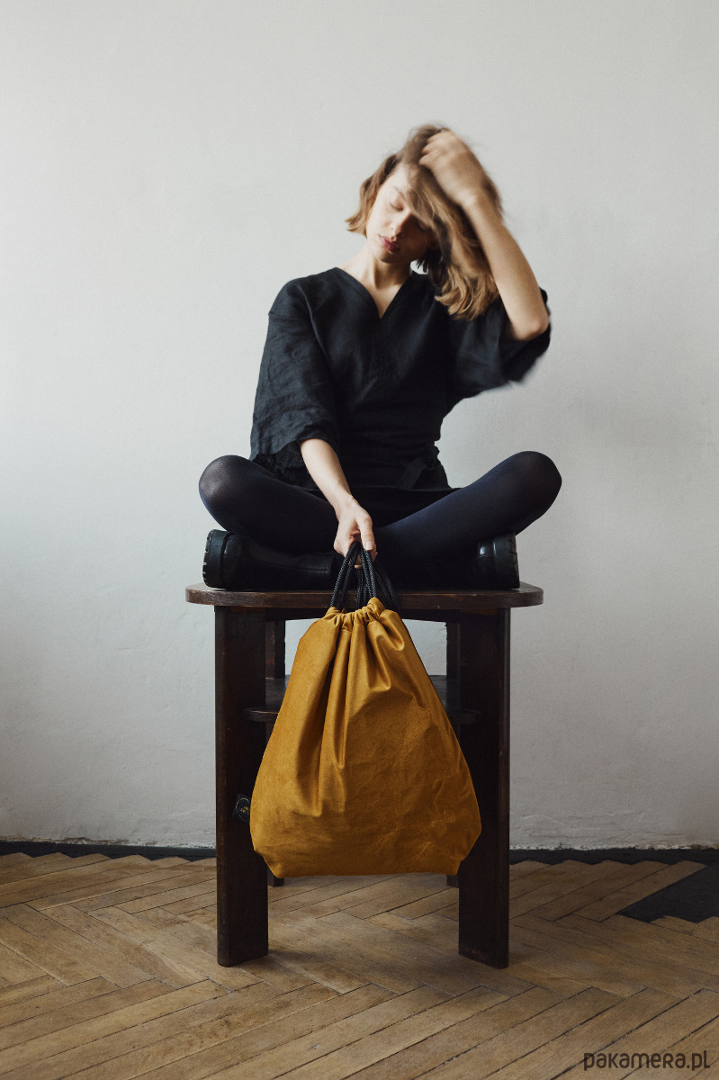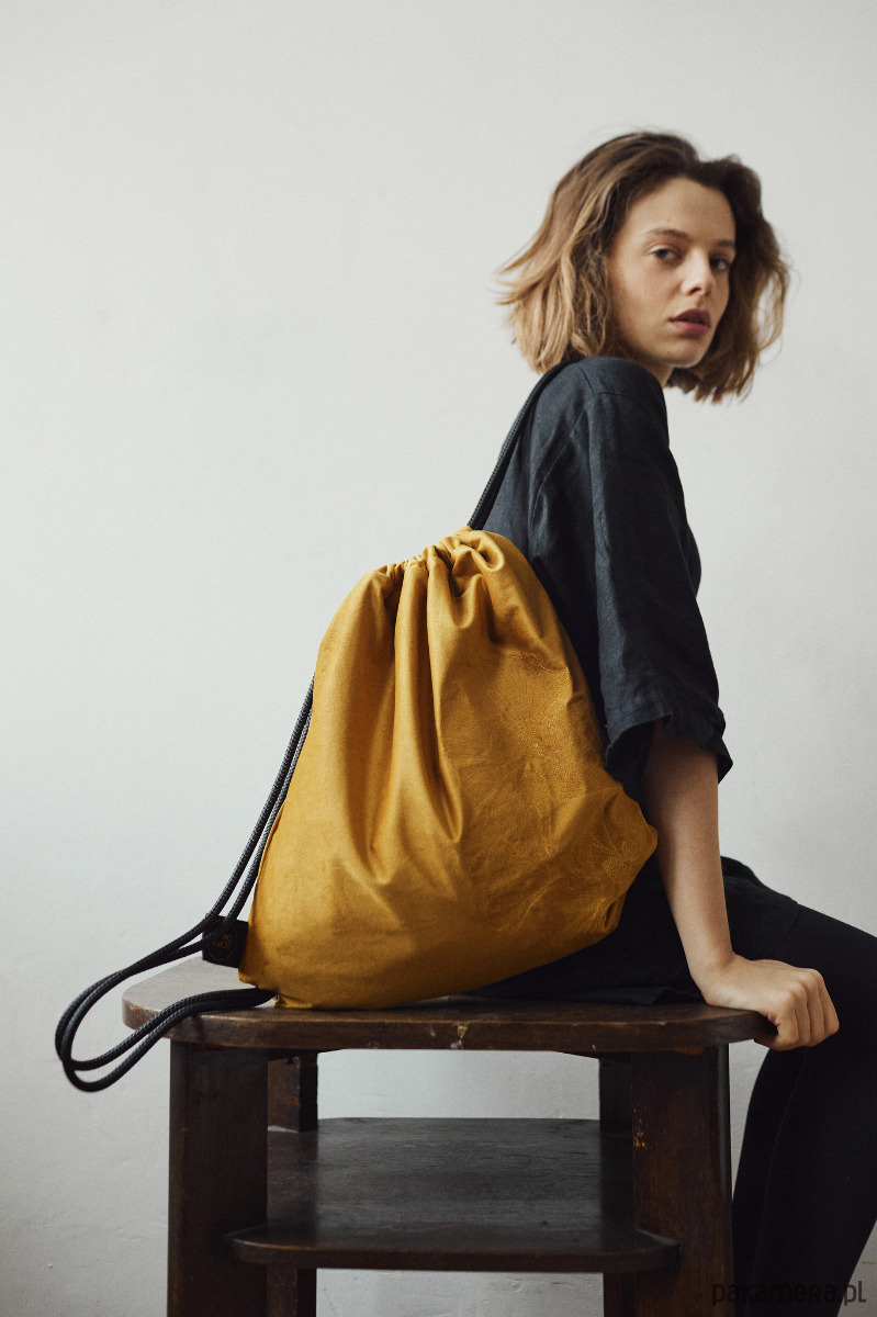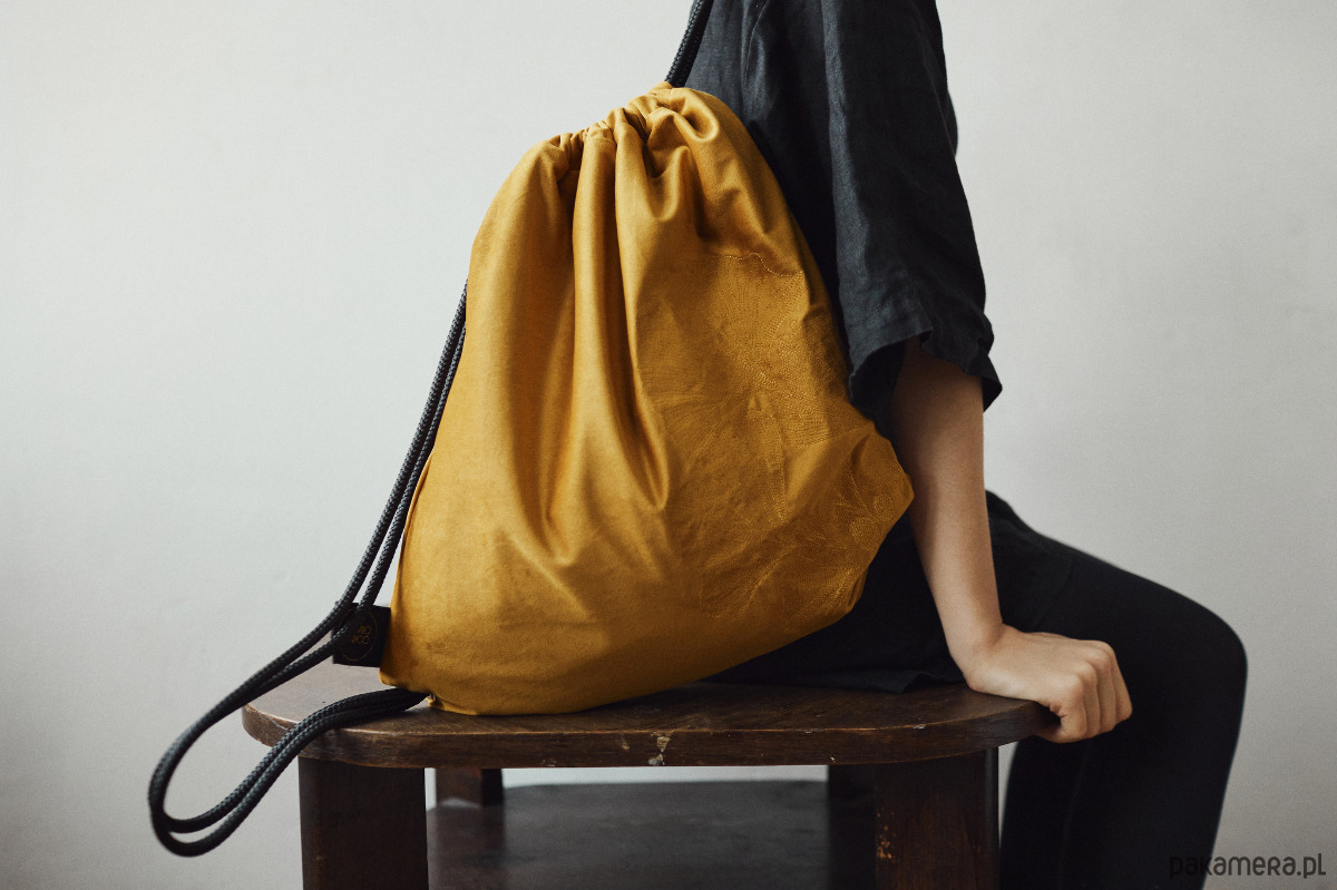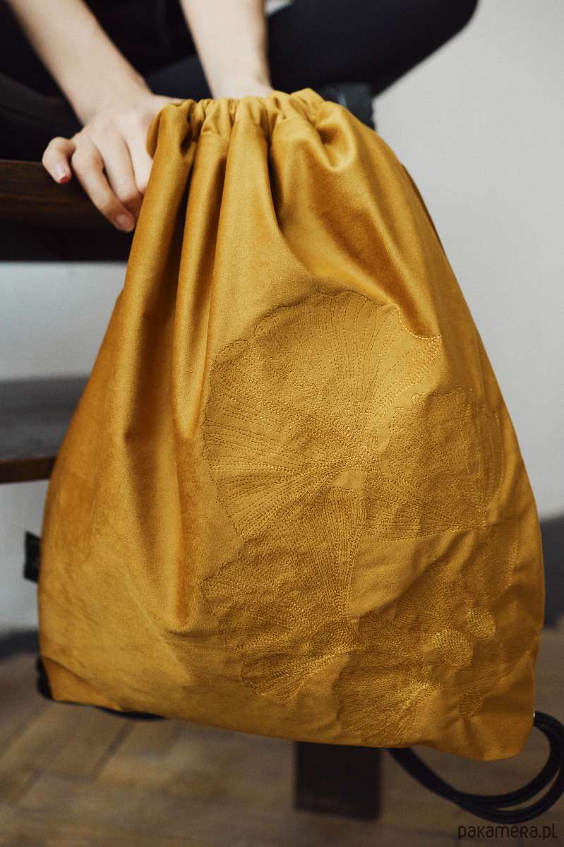 Niezwykły plecak w formie worka w kolorze miodowym. Dodatkowo zdobi go efektowny, autorski haft - liście miłorzęby japońskiego. Haft wyróżnia się fakturą. Nici wtapiają się w aksamitną tkaninę. Subtelny połysk haftu wybija się z matowości velvetu.