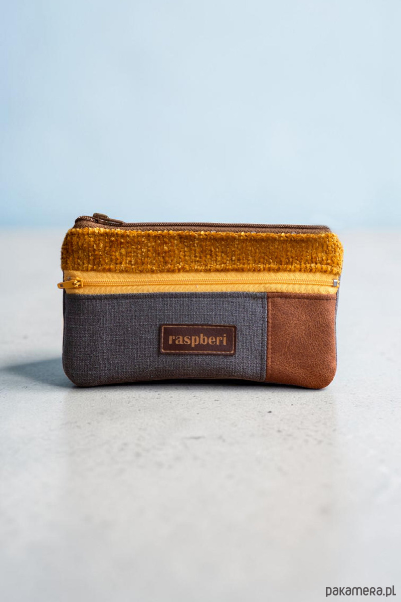 Prosty portfel wykonany z kilku rodzajów tkanin w kolorach miodowym, rudym i grafitowym. Portfel wykonany tylko w jednym egzemplarzu. Stworzony w duchu no waste.