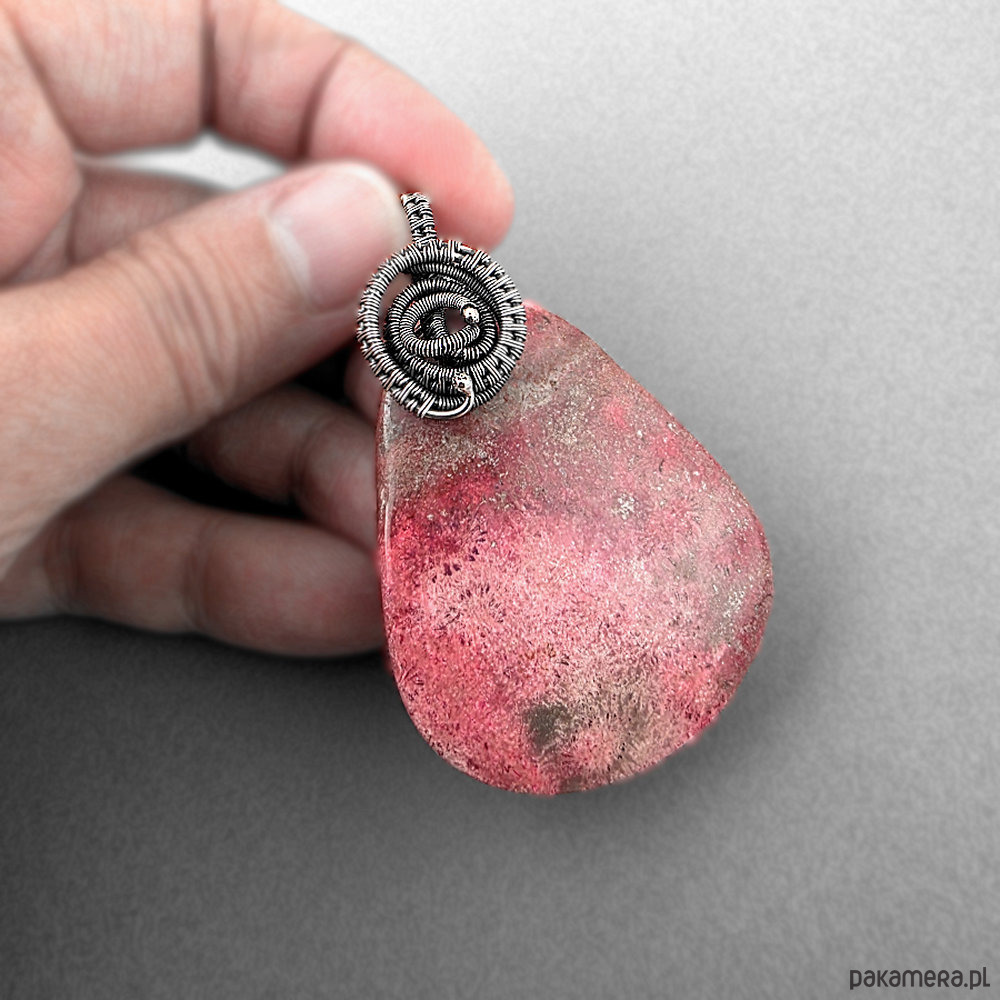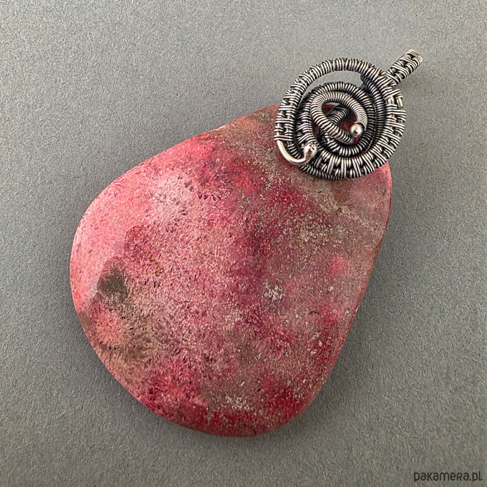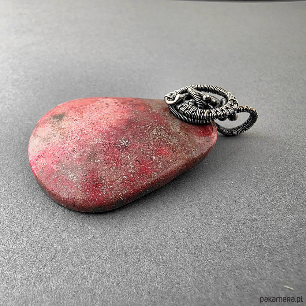 Ten unikalny wisiorek z różowego jaspisu zachwyca paletą subtelnych, a jednocześnie intensywnych barw przypominających akwarelowe pejzaże malowane światłem i ziemią. Barwa kamienia to melanż ciepłych odcieni różu – od pudrowego, niemal pastelowego tonu, przez nasycony karmin, aż po głęboki burgund z akcentami rdzawej czerwieni. Tu i ówdzie pojawiają się szarości, przypominające cień chmur na polnych ścieżkach. W fakturze powierzchni widoczne są nieregularne mikrowzory, niczym porowata kora drzewa lub powierzchnia dawno zaschniętej gliny - ale to tylko aspekt wizualny, w rzeczywistości powierzchnia wypolerowana jest do połysku.