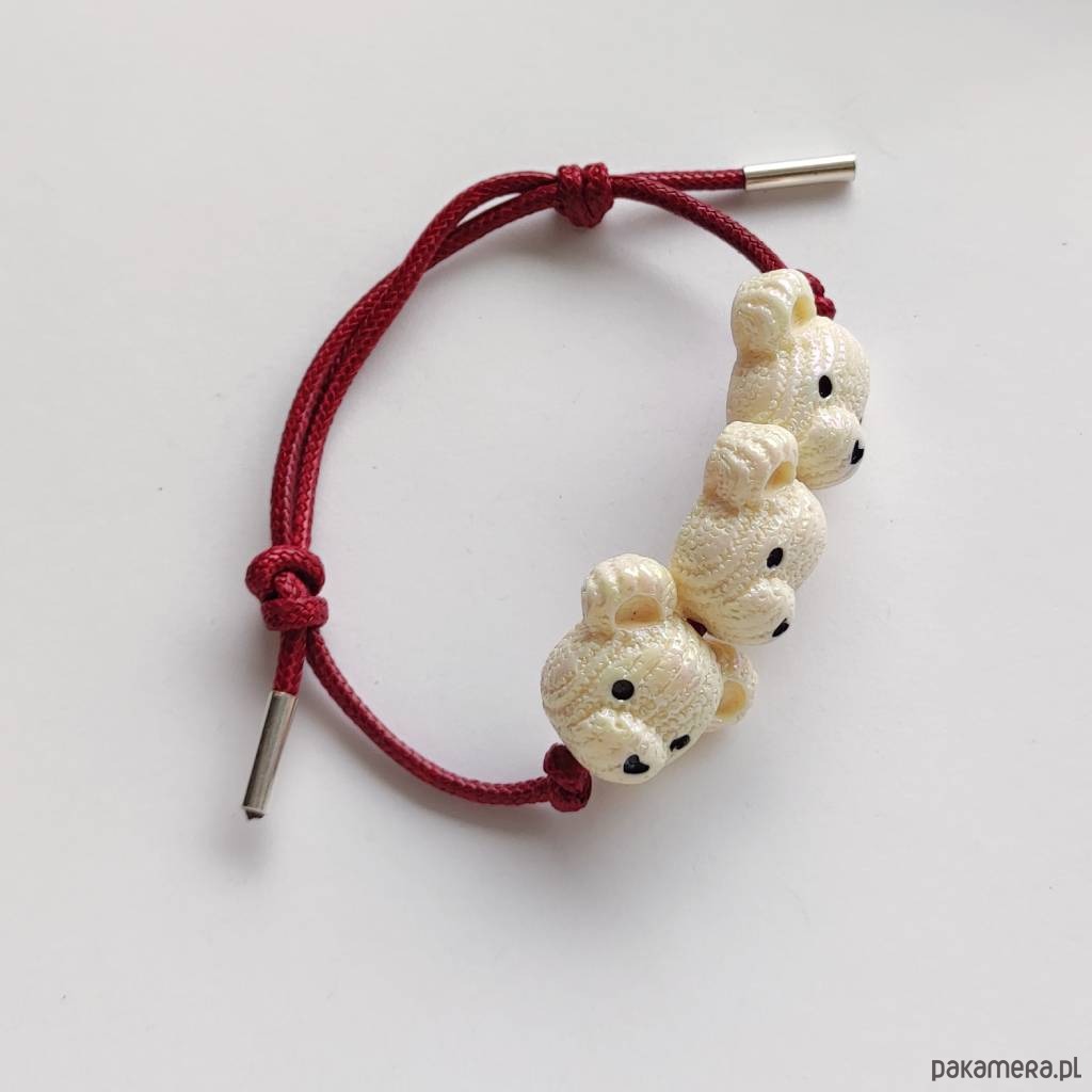 MIŚ bransoletka- uroczy design. Nietuzinkowy dodatek idealnie stanowi uzupełnienie swobodnych, casualowych stylizacji. Bransoletka wykonana są z :koralik akrylowy – miś – (23X 19 mm), ozdobny sznurek, srebro pr. 925. Ten niebanalny drobiazg na pewno wywoła uśmiech na Twojej twarzy.