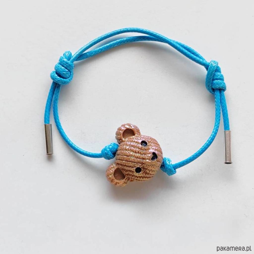 MIŚ bransoletka- uroczy design. Nietuzinkowy dodatek idealnie stanowi uzupełnienie swobodnych, casualowych stylizacji. Bransoletka wykonana są z :koralik akrylowy – miś – (23X 19 mm), ozdobny sznurek, srebro pr. 925. Ten niebanalny drobiazg na pewno wywoła uśmiech na Twojej twarzy.