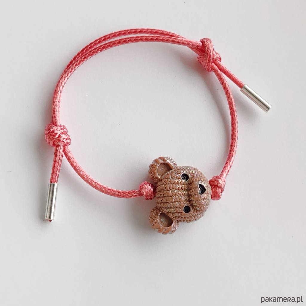 MIŚ bransoletka- uroczy design. Nietuzinkowy dodatek idealnie stanowi uzupełnienie swobodnych, casualowych stylizacji. Bransoletka wykonana są z :koralik akrylowy – miś – (23X 19 mm), ozdobny sznurek, srebro pr. 925. Ten niebanalny drobiazg na pewno wywoła uśmiech na Twojej twarzy.