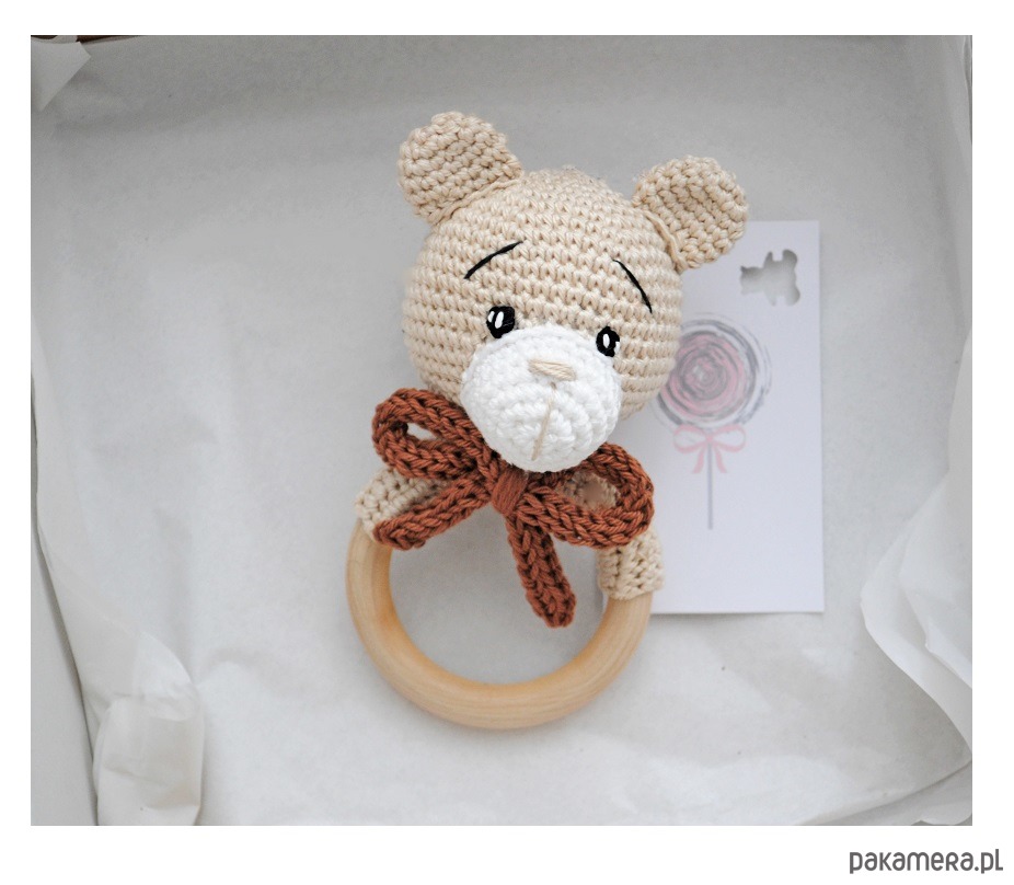 Dekoracja została wykonany z bawełny, na bazie/obręczy z naturalnego drewna). Wypełnienie głowy misia to puch antyalergiczny.