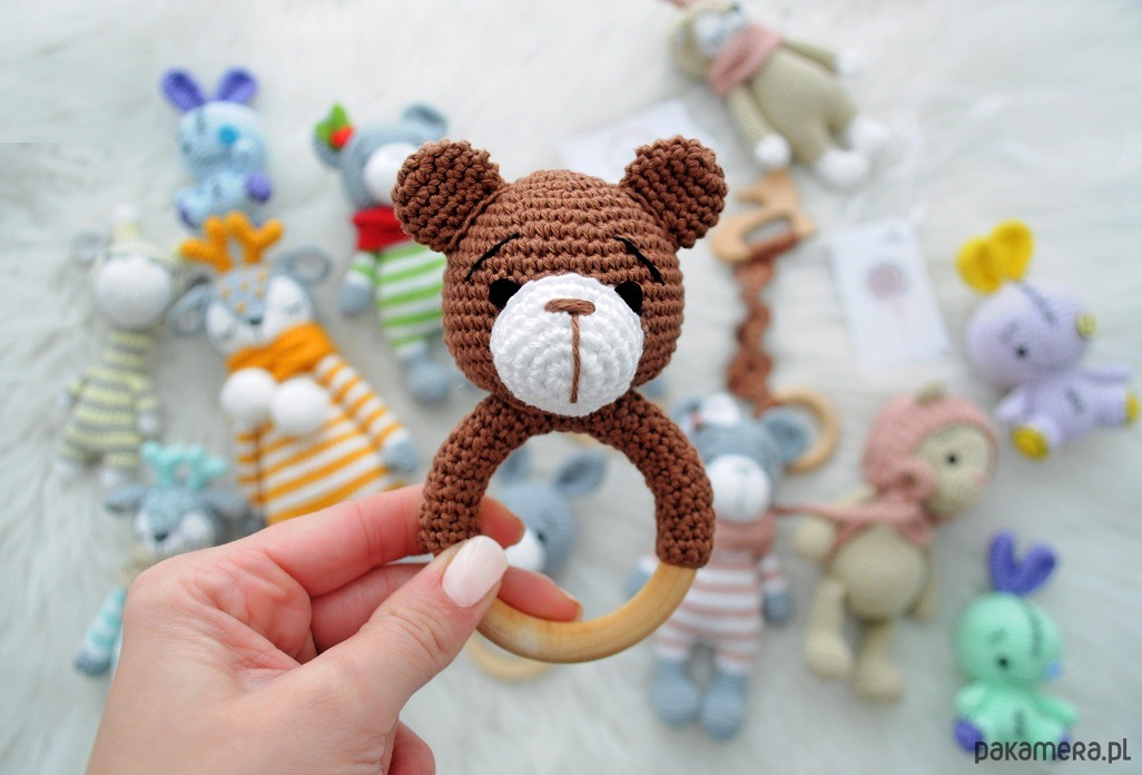 Dekoracja została wykonany z bawełny, na bazie/obręczy z naturalnego drewna. Wypełnienie głowy misia to puch antyalergiczny.