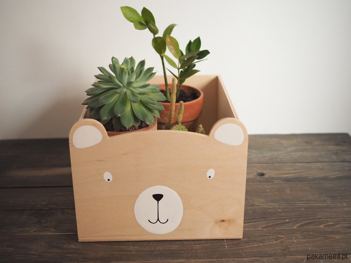 Pojemnik wielofunkcyjny do pokoju dziecięcego, mieszczący rysunki, kartki A4, książki, zabawki itd. Wymiary zewnętrzne: 25x34cm wys. 16cm, a wraz z uszkami 19,5cm. Wewnątrz: 23,5 x 32,5 cm. W całości pomalowany akrylowym lakierem bezbarwnym, wzór namalowany ręcznie wodoodpornymi farbami akrylowymi.