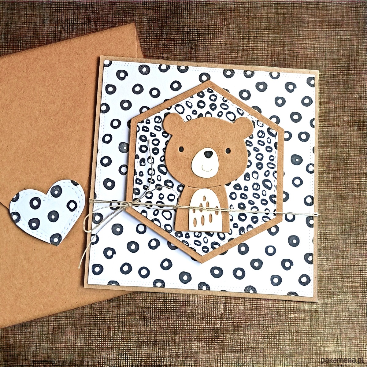 urocza kartka z okazji narodzin bobasa/ chrztu lub urodzinek - wykonana na bazie kartonu eko-kraft (100% makulatury), ozdobiona wzorzystym kartonem z ozdobnymi przeszyciami na krawędziach (lub fakturowanym przeze mnie kartonem - w zależności od modelu); na środku zamocowany duży, przestrzenny element z przesłodkim misiem; kartka przewiązana jutowym sznureczkiem.