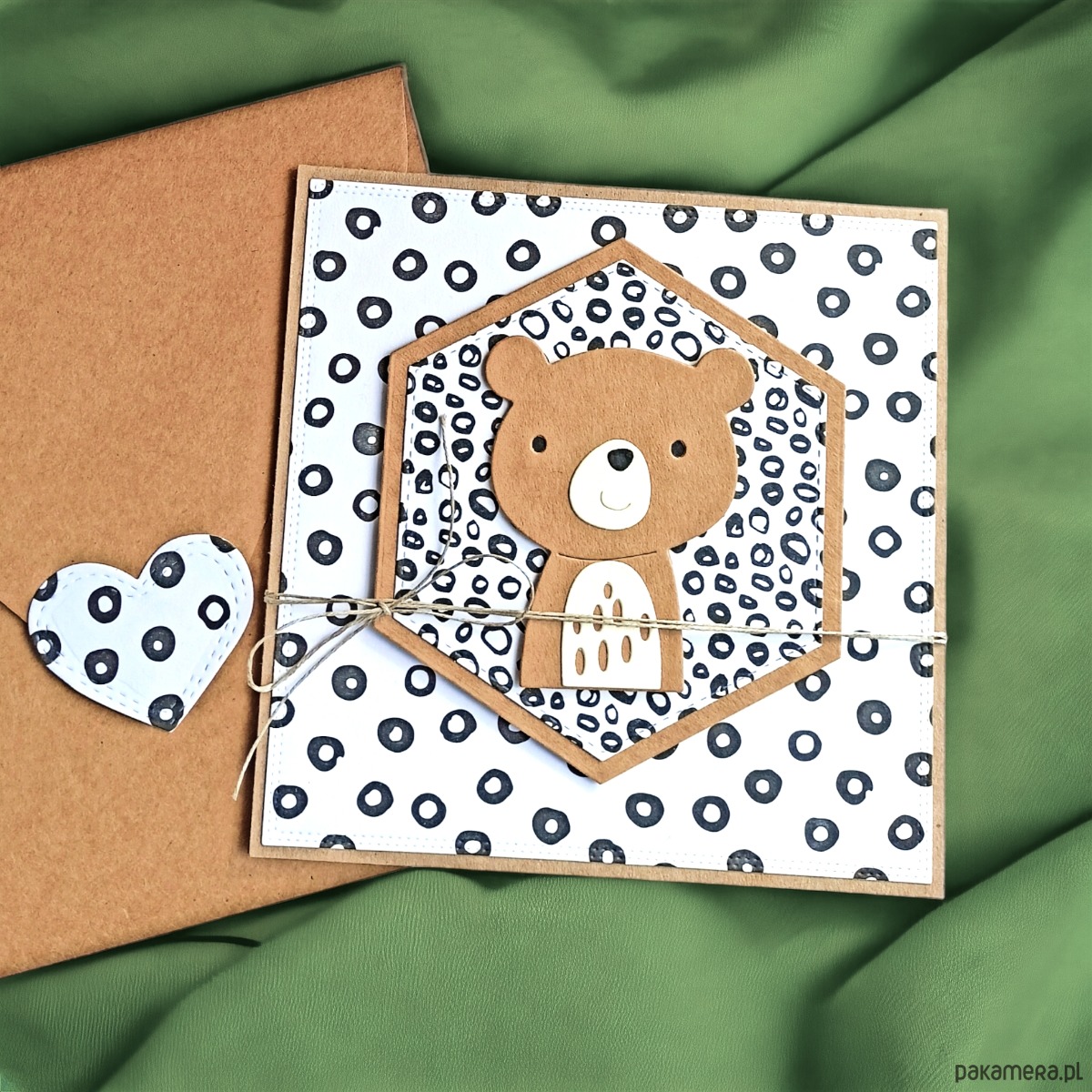 urocza kartka z okazji narodzin bobasa/ chrztu lub urodzinek - wykonana na bazie kartonu eko-kraft (100% makulatury), ozdobiona wzorzystym kartonem z ozdobnymi przeszyciami na krawędziach (lub fakturowanym przeze mnie kartonem - w zależności od modelu); na środku zamocowany duży, przestrzenny element z przesłodkim misiem; kartka przewiązana jutowym sznureczkiem.
