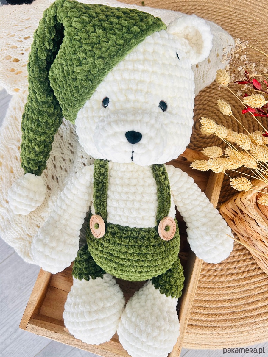 Miś z ogłoszenia jest w kolorze ecru w zielonych spodenkach i czapeczce