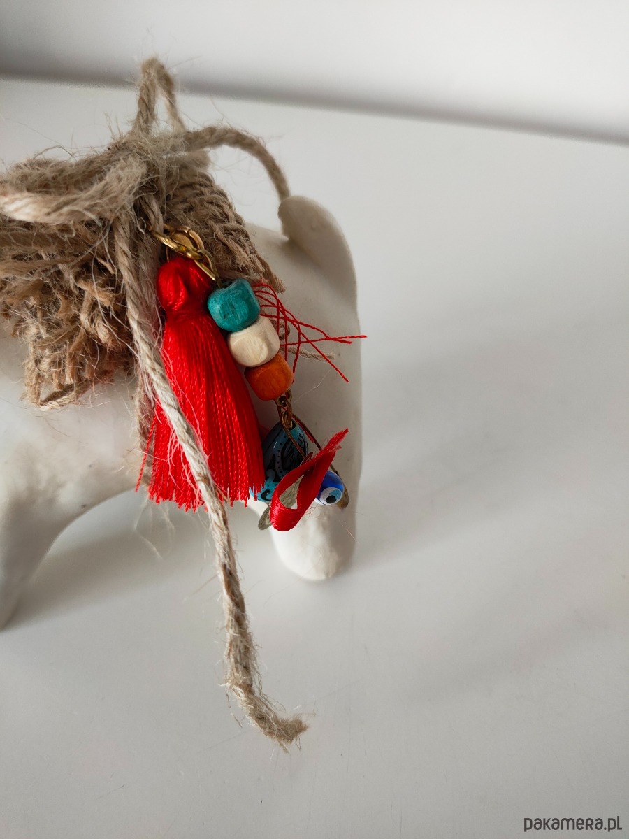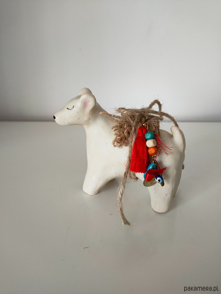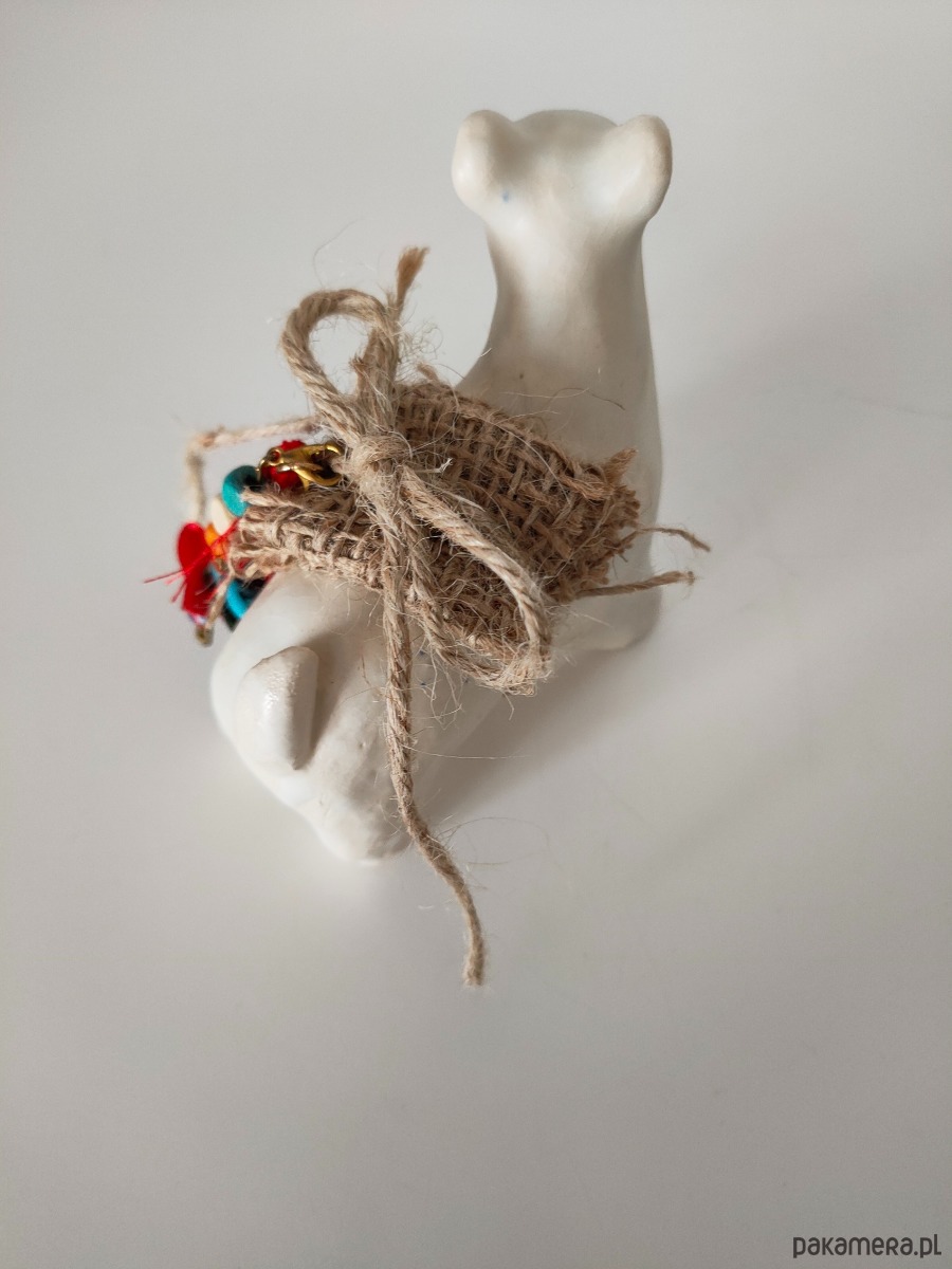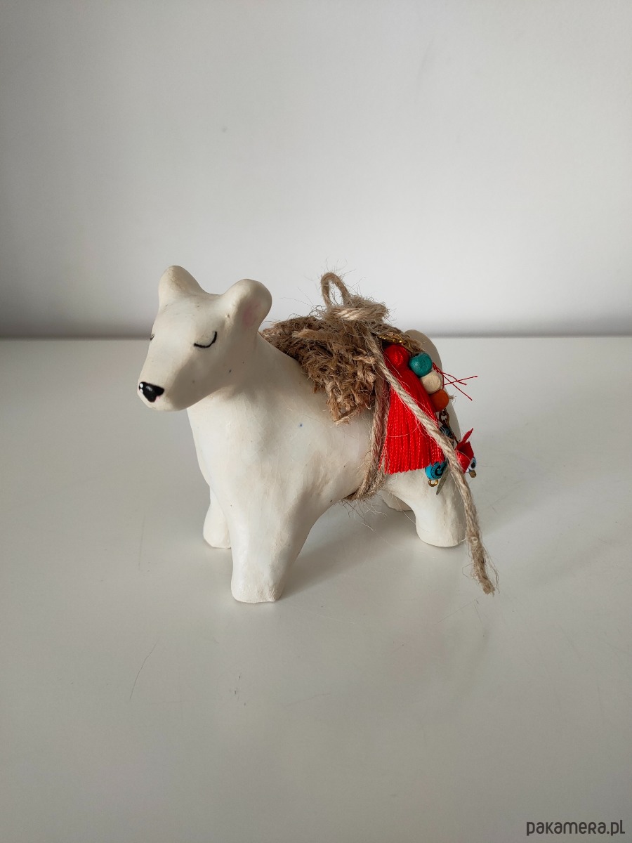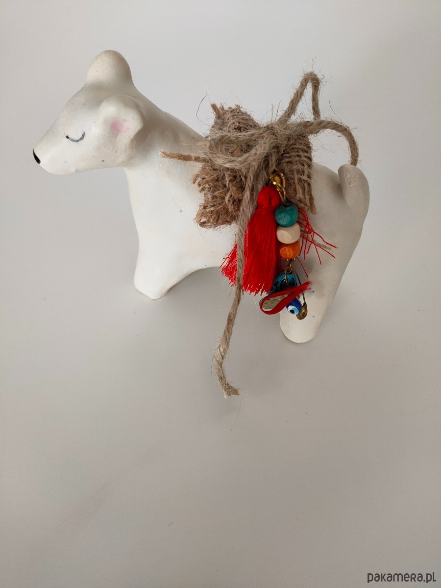 Zdobiony malutkimi kwiatuszkami, na plecach niesie bagaż.