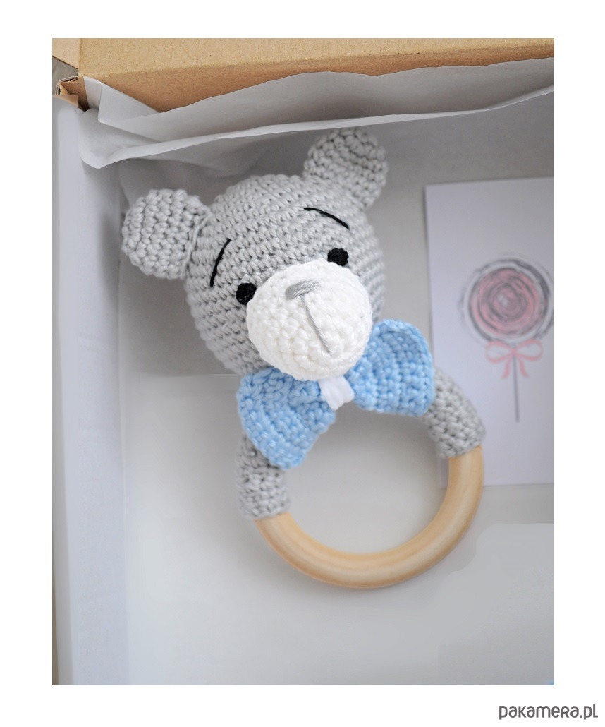 Dekoracja została wykonany z bawełny, na bazie/obręczy z naturalnego drewna (drewno nie jest polerowane na wysoki połysk). Wypełnienie głowy misia to puch antyalergiczny.