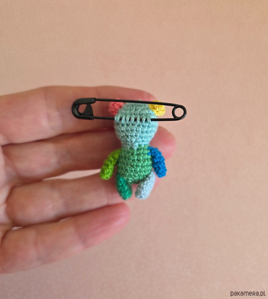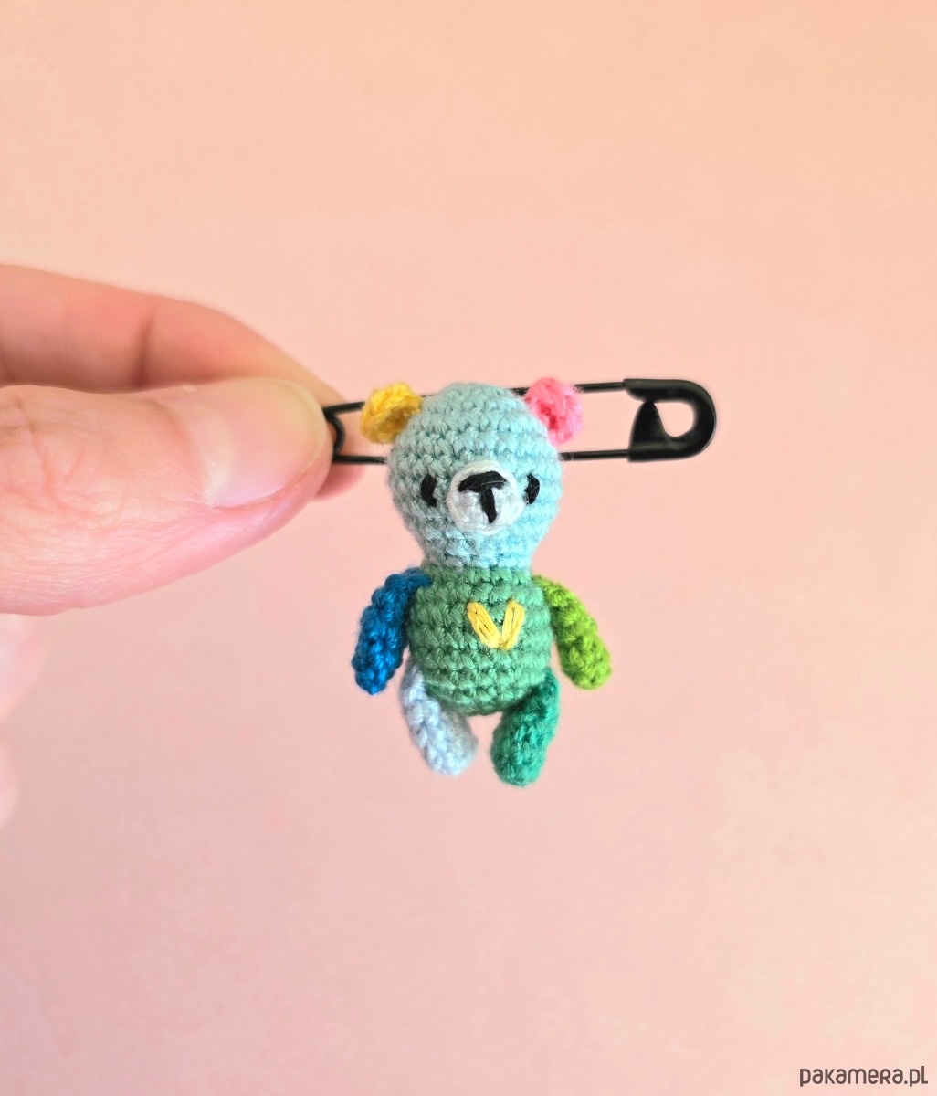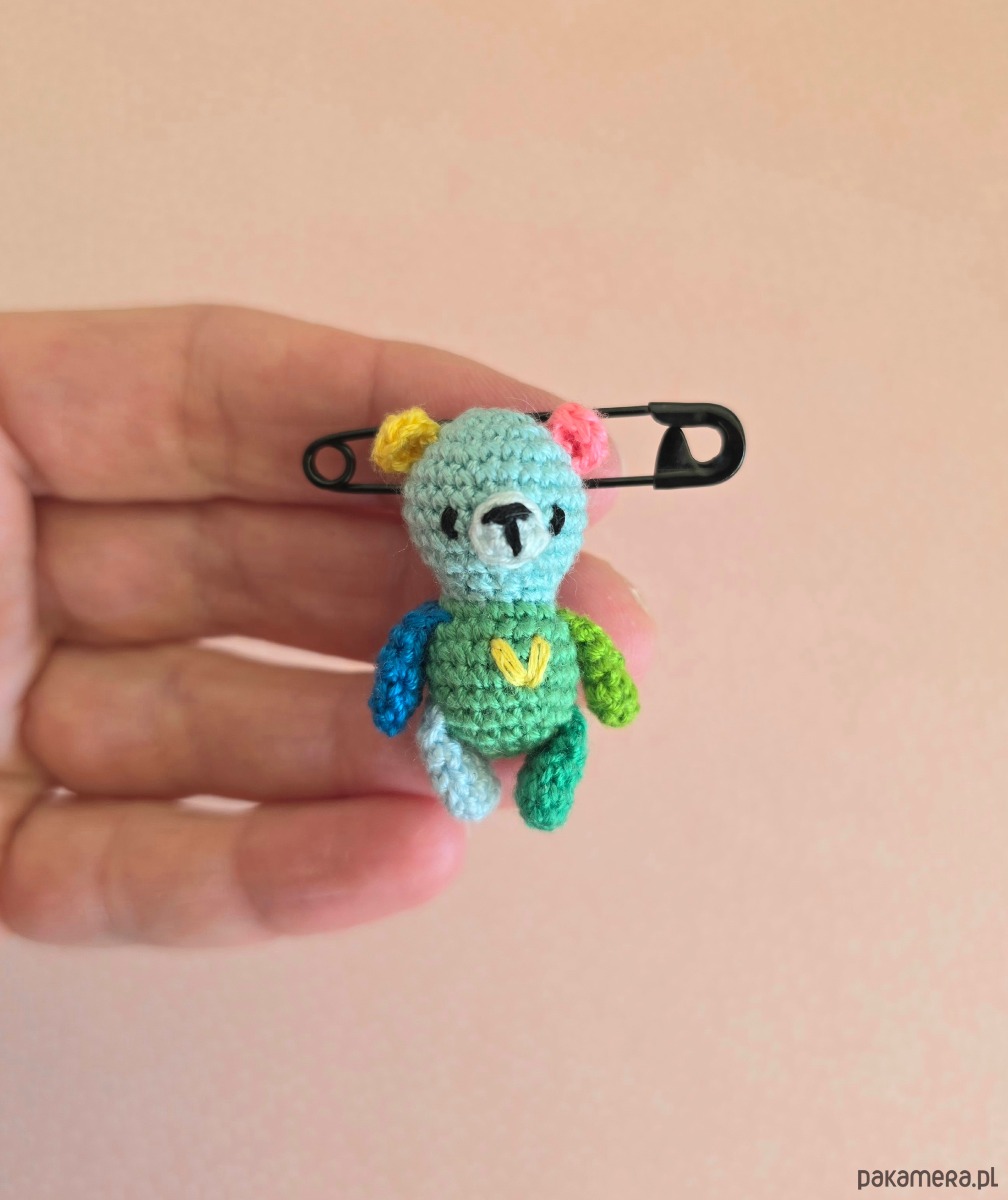 Miś ma około 4 cm wzrostu i wykonany został na szydełku z miłością, starannością i dbałością o detale. Na czarnej agrafce o długości 4 cm.