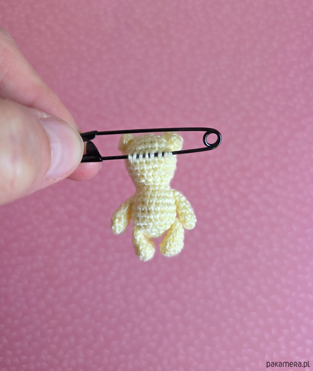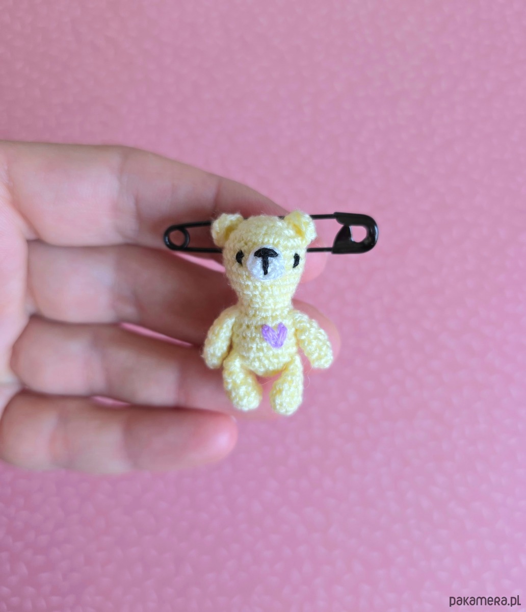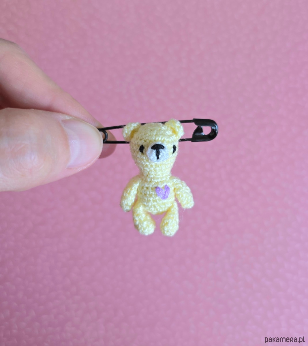 Miś ma około 4 cm wzrostu i wykonany został na szydełku z miłością, starannością i dbałością o detale. Na czarnej agrafce o długości 4 cm.
