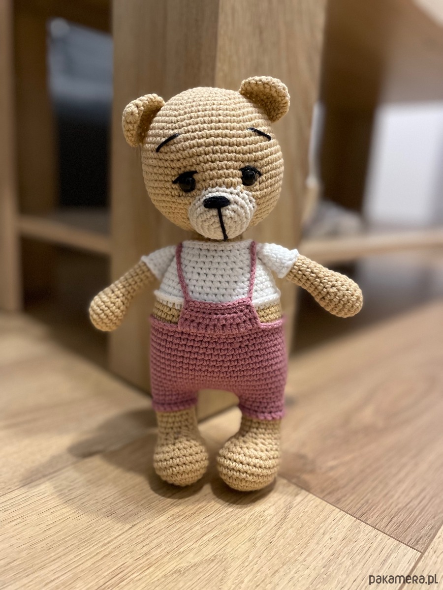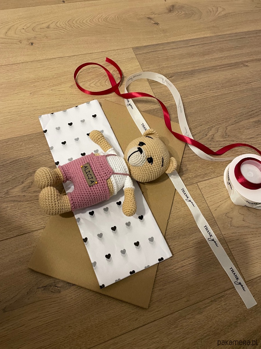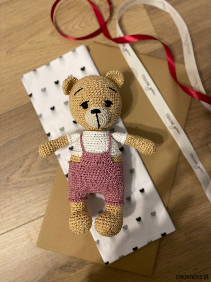 Prezentuje pięknego misia wykonanego ręcznie na szydełku! Jest on dostępny od ręki idealnie sprawdzi się jako przytulanka na prezent z różnych okazji: zbliżających się świąt, jako pamiątka chrztu świętego, z okazji narodzin/ urodzin.