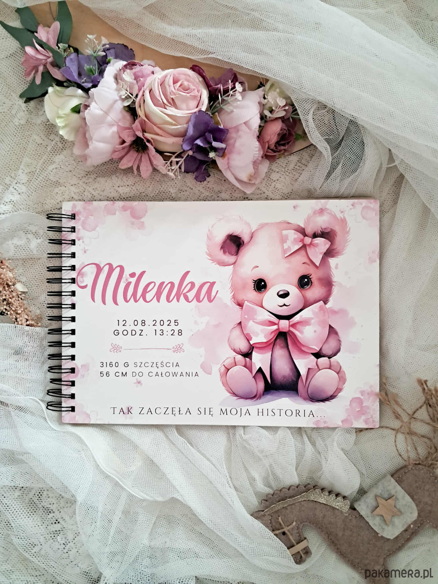 MIŚ RÓŻOWY album pamiątka chrztu, roczek, narodziny,