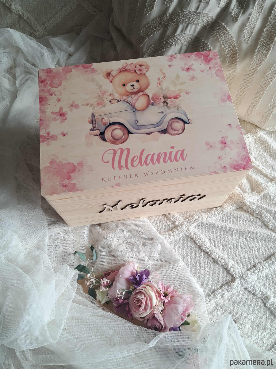 Zamknij najpiękniejsze chwile dzieciństwa w wyjątkowym kuferku wspomnień! Ten uroczy, drewniany kuferek z motywem misi w autku to idealny prezent dla dziewczynki. Personalizowany imieniem, będzie cenną pamiątką na całe życie.