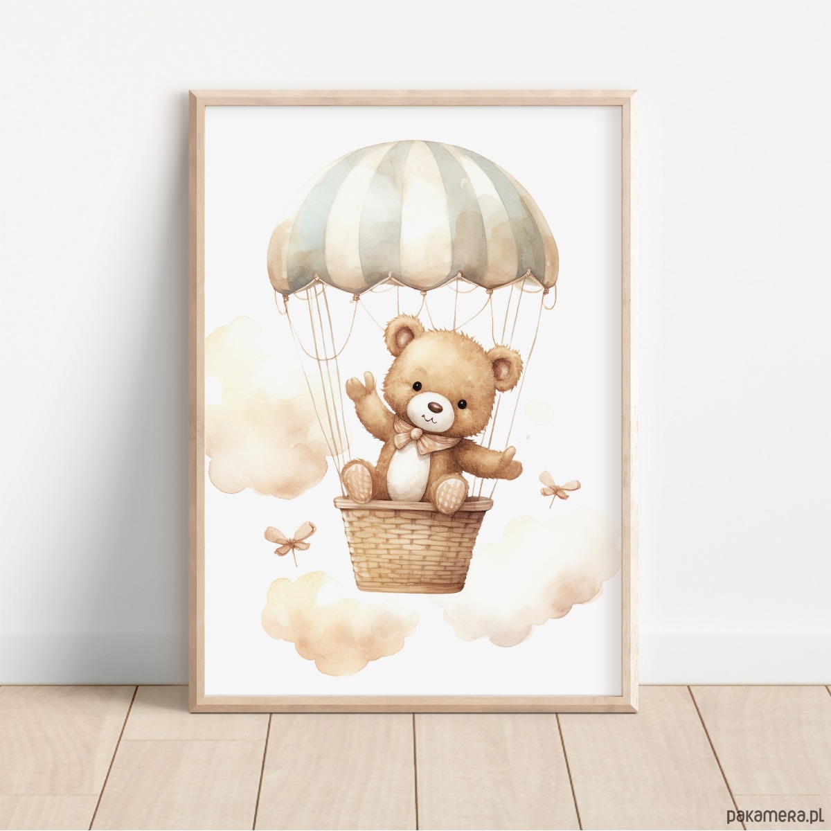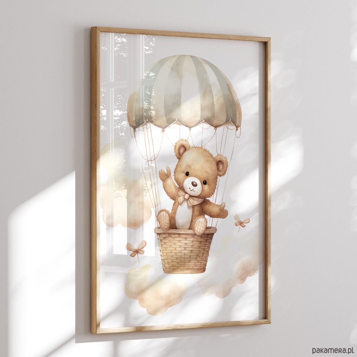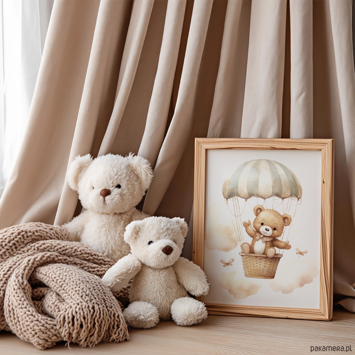 Miś w balonie w pastelowej kolorystyce z kolekcji Pastelowe Misie. Delikatna ilustracja w jasnych, neutralnych barwach, pasująca do aranżacji pokoju dziecka. Plakat można zestawić z innymi wzorami z tej samej serii.