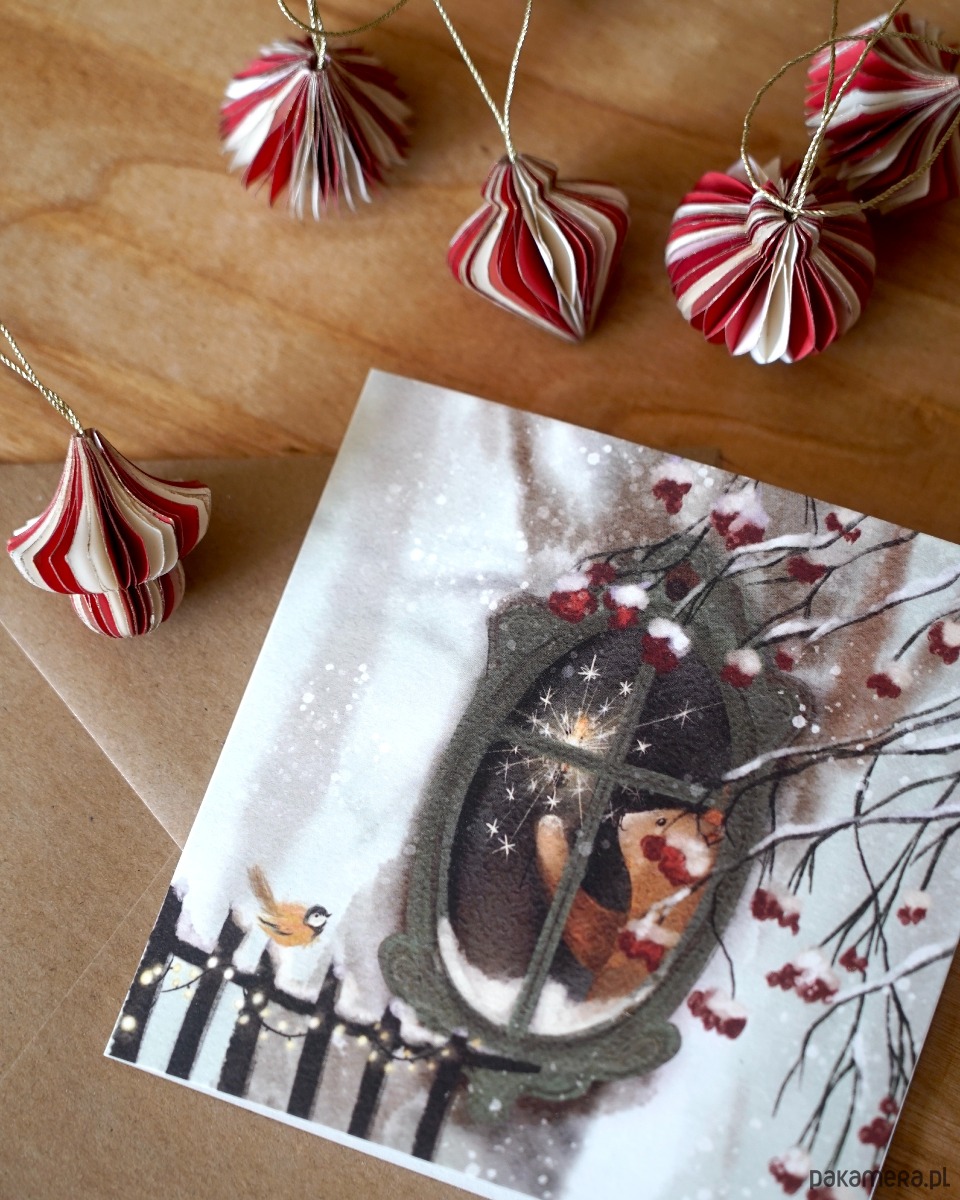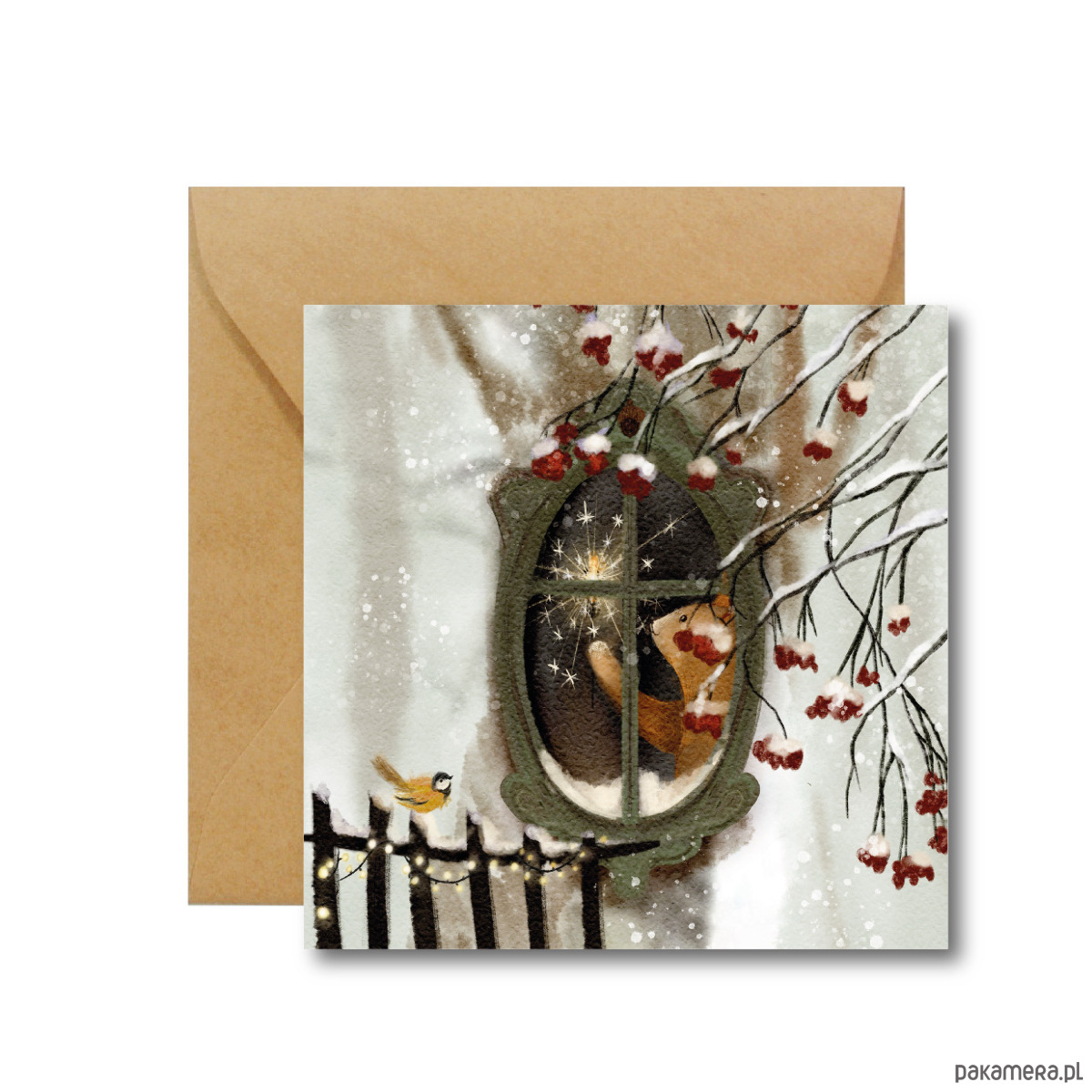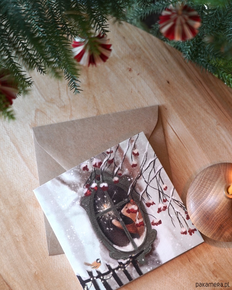 Miś w oknie świątecznym - wyjątkowo klimatyczna kartka na Boże Narodzenie.