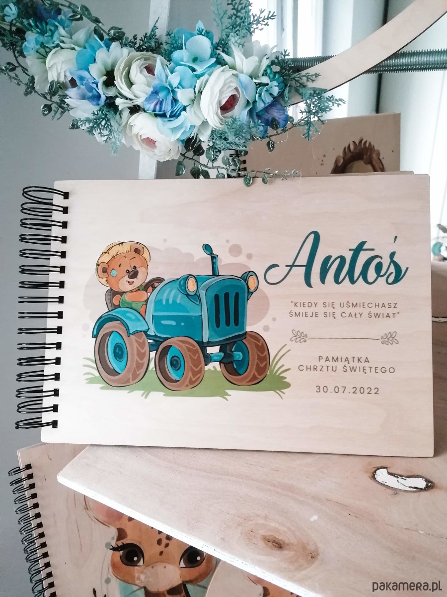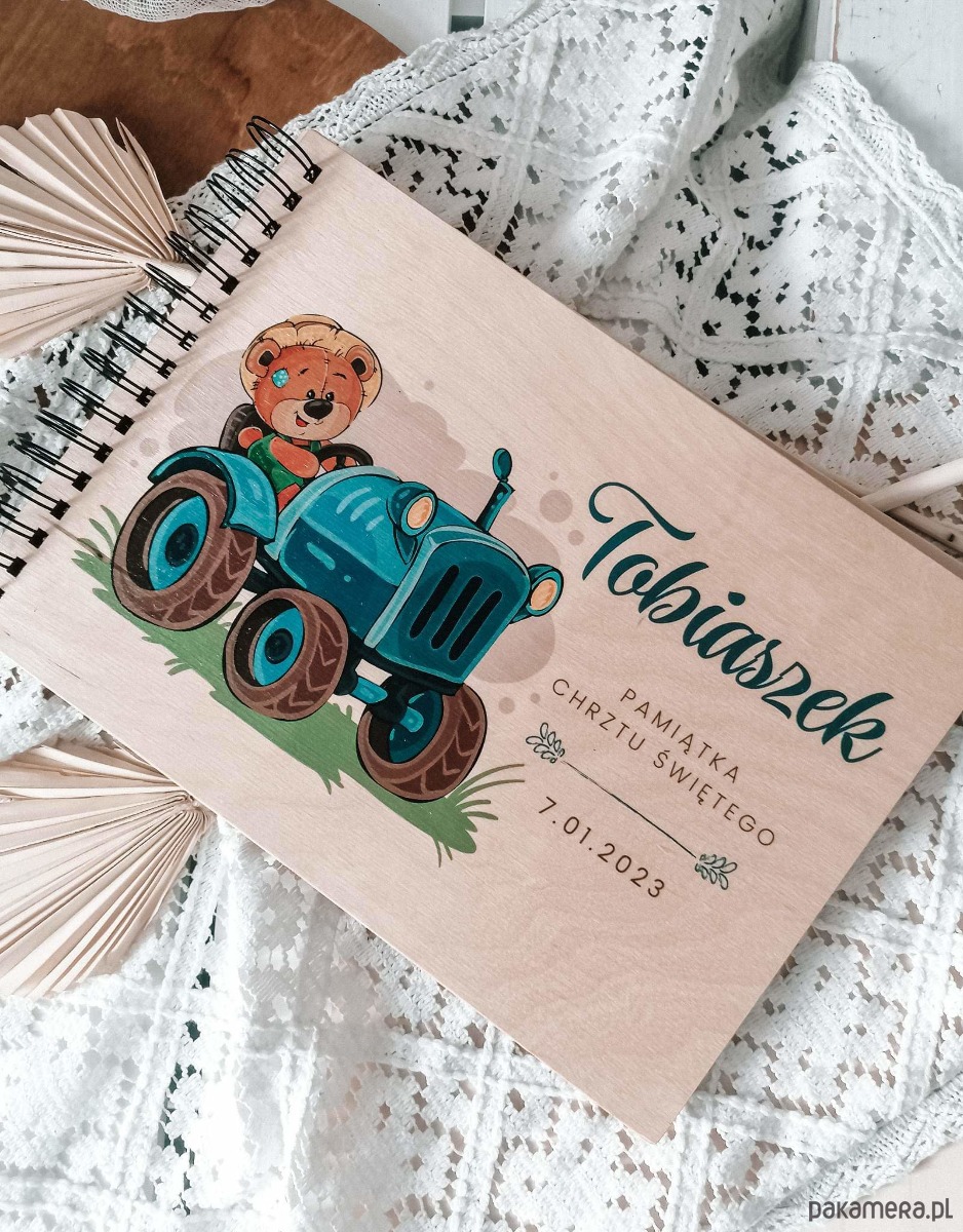 Album z grafiką misia w traktorze. Piękny i oryginalny prezent na dzień dziecka, chrzest, roczek, narodziny dziecka..