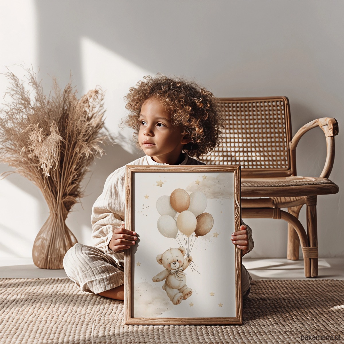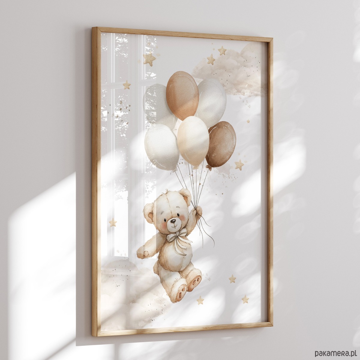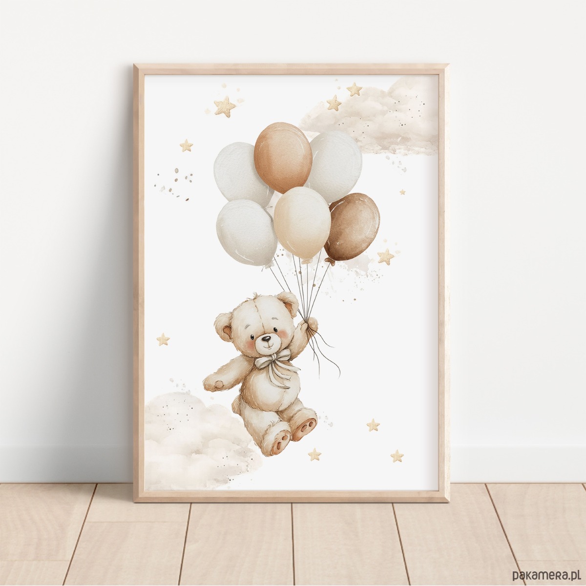 Plakat z ilustracją misia unoszącego się na pastelowych balonikach. Lekka, jasna grafika w neutralnych kolorach sprawia, że dekoracja nie dominuje wnętrza i łatwo zestawić ją z innymi plakatami z kolekcji Pastelowe Misie. Sprawdzi się jako pojedynczy akcent lub element większej kompozycji na ścianie.