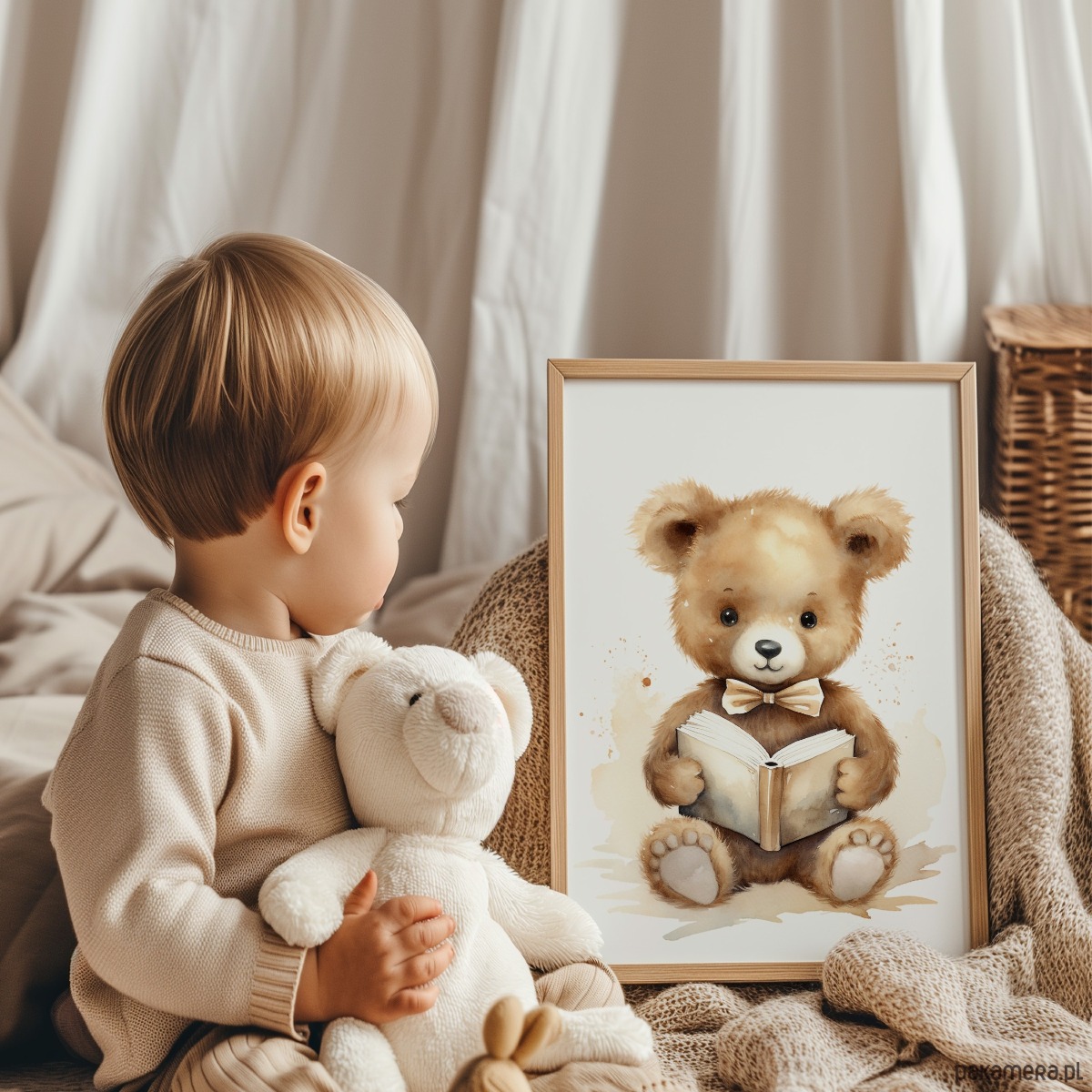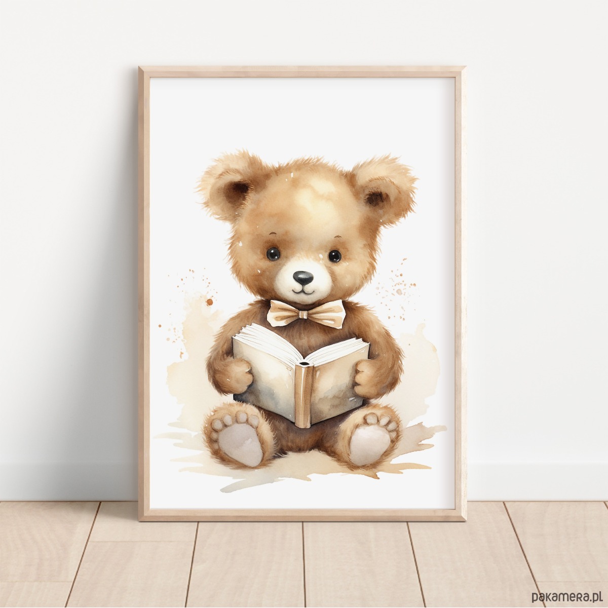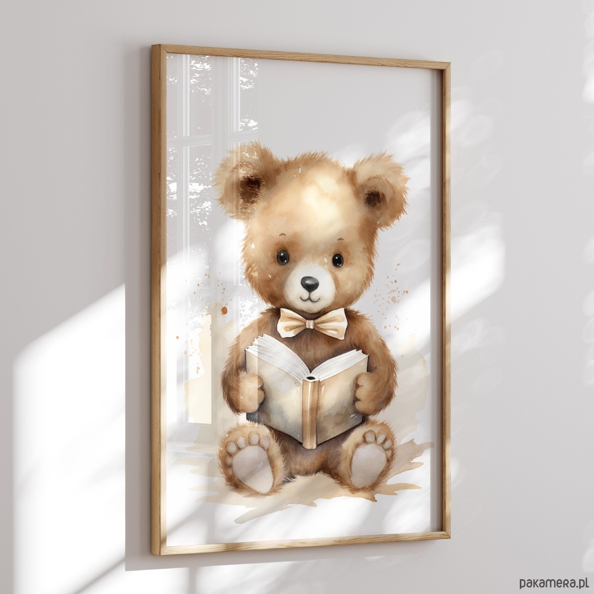 Plakat z misiem trzymającym książkę, utrzymany w jasnej, pastelowej kolorystyce z kolekcji Pastelowe Misie. Delikatna ilustracja sprawdzi się jako dekoracja do pokoju dziecka, kącika do czytania lub strefy zabawy. Plakat można zestawić z innymi wzorami z tej samej kolekcji, tworząc spójną kompozycję na ścianie.