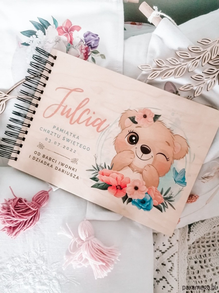 Śliczny album na zdjęcia wklejane z okładką misia (a raczej Misi) i kwiatów. Urocza grafika, dla fanek mięciutkich przytulanek i pluszaków. Na okładce imię dziecka oraz dowolna personalizacja (cytat, napis, data narodzin, czy metryczka). Możliwa również krótka dedykacja.