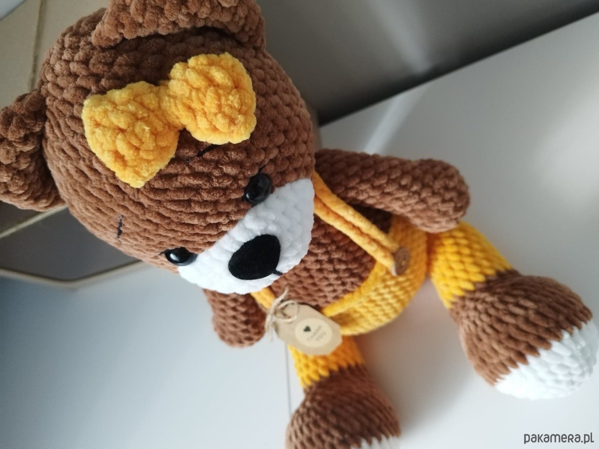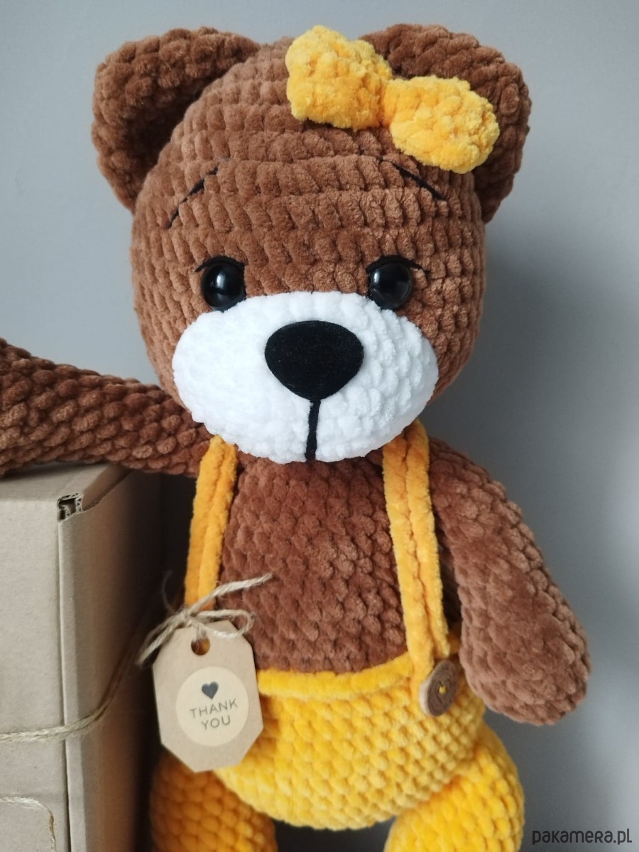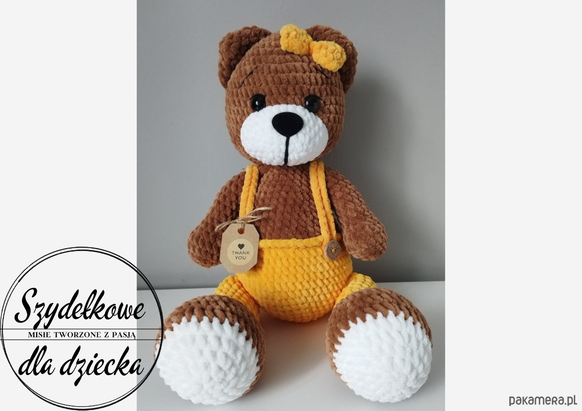 Oferuję uroczego, ręcznie wykonanego misia z żółtymi spodniami na szelkach i uroczo dopasowaną kokardką na głowie. Miś został stworzony z miękkiej włóczki Himalaya Dolphin Baby, co dodaje mu wyjątkowej miękkości i przyjemności dotyku. Jego hipoalergiczne wypełnienie oraz bezpieczne oczka i nos gwarantują nie tylko urok, ale także bezpieczeństwo. Ten uroczy miś może być o długości ok. 40cm lub 48 cm (na zdjęciu miś ma ok. 40cm) oraz w wersji dla dziewczynki lub dla chłopca (bez kokardki na głowie). Jest to idealny towarzysz do przytulania i ozdabiania wnętrza. Daj mu szansę, aby przyniósł radość i ciepło do Twojego życia lub życia bliskiej osoby!