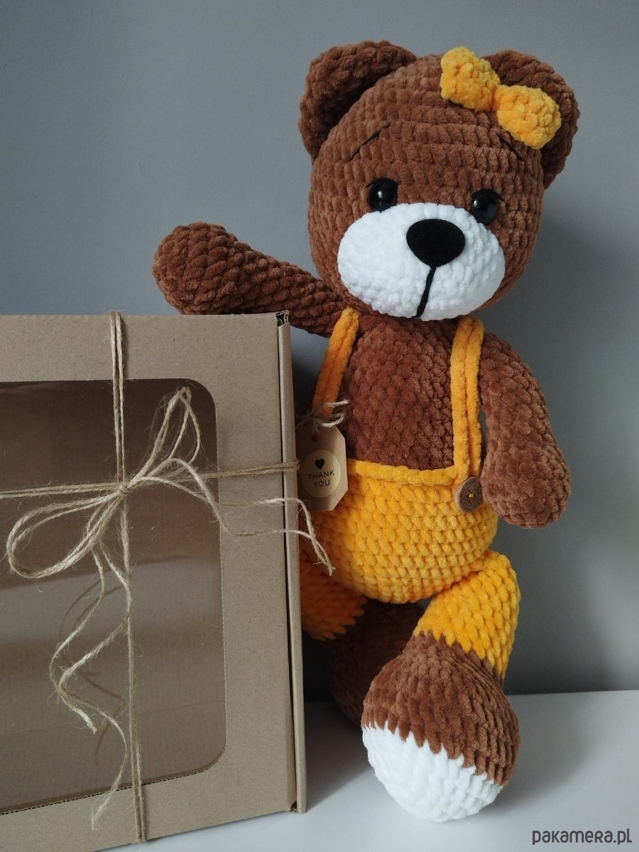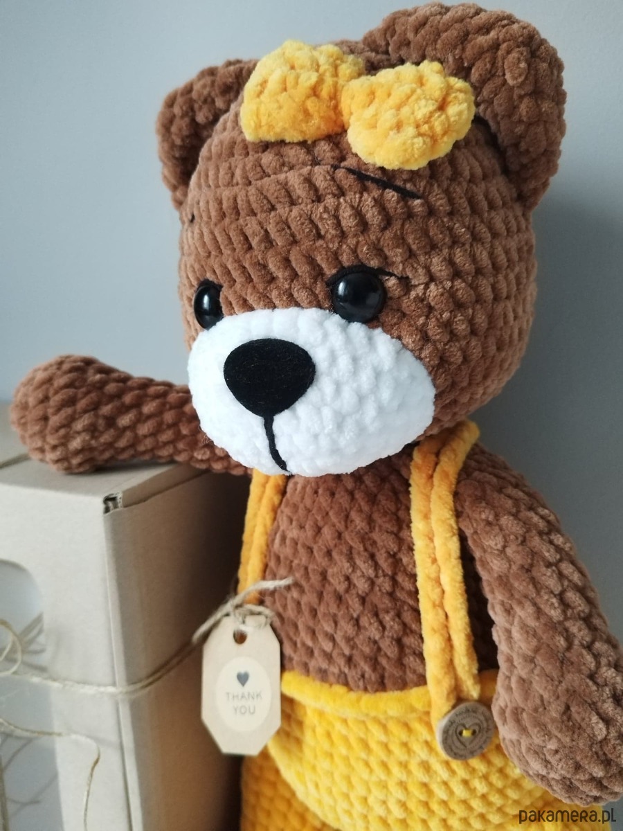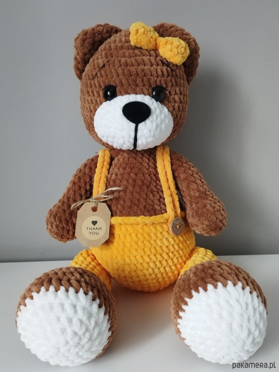 Oferuję uroczego, ręcznie wykonanego misia z żółtymi spodniami na szelkach i uroczo dopasowaną kokardką na głowie. Miś został stworzony z miękkiej włóczki Himalaya Dolphin Baby, co dodaje mu wyjątkowej miękkości i przyjemności dotyku. Jego hipoalergiczne wypełnienie oraz bezpieczne oczka i nos gwarantują nie tylko urok, ale także bezpieczeństwo. Ten uroczy miś może być o długości ok. 40cm lub 48 cm (na zdjęciu miś ma ok. 40cm) oraz w wersji dla dziewczynki lub dla chłopca (bez kokardki na głowie). Jest to idealny towarzysz do przytulania i ozdabiania wnętrza. Daj mu szansę, aby przyniósł radość i ciepło do Twojego życia lub życia bliskiej osoby!