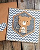 urocza kartka z okazji narodzin bobasa/ chrztu lub urodzinek - wykonana na bazie kartonu eko-kraft (100% makulatury), ozdobiona wzorzystym kartonem z ozdobnymi przeszyciami na krawędziach (lub fakturowanym przeze mnie kartonem - w zależności od modelu); na środku zamocowany duży, przestrzenny element z przesłodkim misiem; kartka przewiązana jutowym sznureczkiem.