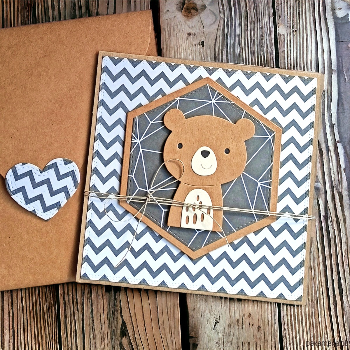 urocza kartka z okazji narodzin bobasa/ chrztu lub urodzinek - wykonana na bazie kartonu eko-kraft (100% makulatury), ozdobiona wzorzystym kartonem z ozdobnymi przeszyciami na krawędziach (lub fakturowanym przeze mnie kartonem - w zależności od modelu); na środku zamocowany duży, przestrzenny element z przesłodkim misiem; kartka przewiązana jutowym sznureczkiem.