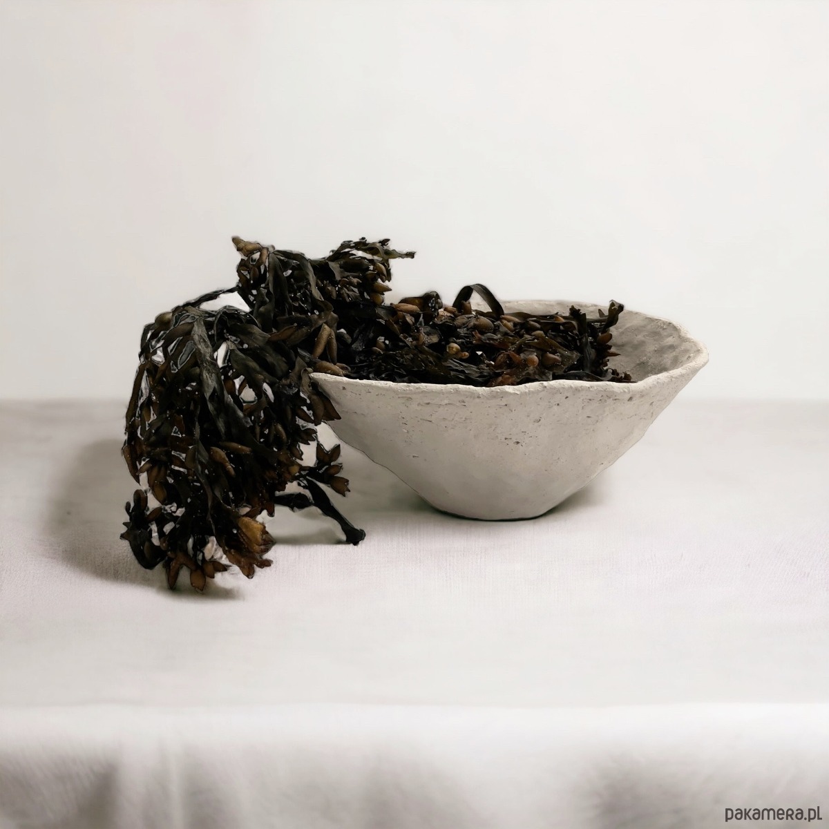 Ręcznie formowana. Wewnątrz pokryta szkliwem w kolorze ciepłej bieli w satynowym wykończeniu. Z zewnątrz surowa, nierówna faktura gliny nawiązuje do nadmorskich kamieni. Kamienie na plaży mogą symbolizować spokój i relaks, stanowiąc idealne miejsce do wyciszenia się i odpoczynku. Idealne naczynie do serwowania azjatyckich smaków jako naczynie na zupy z makaronem udon ,ramen lub sałatki.