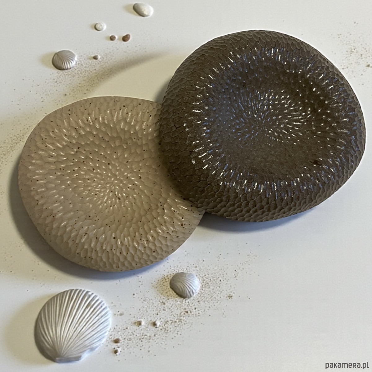 Każdy egzemplarz jest ręcznie wykonany z jasnej gliny w kolorze beżowym i brązowym z kropkowaniem. Pokryta jest transparentnym błyszczącym szkliwem. Ręcznie rzeźbienia na powierzchni inspirowane są naturalnymi strukturami tworząc nieregularne wzory nawiązujące do szumu morskiego wiatru, który dynamicznie zmienia kształt piasku i układa piękne, oryginalne wzory na powierzchni plaży.